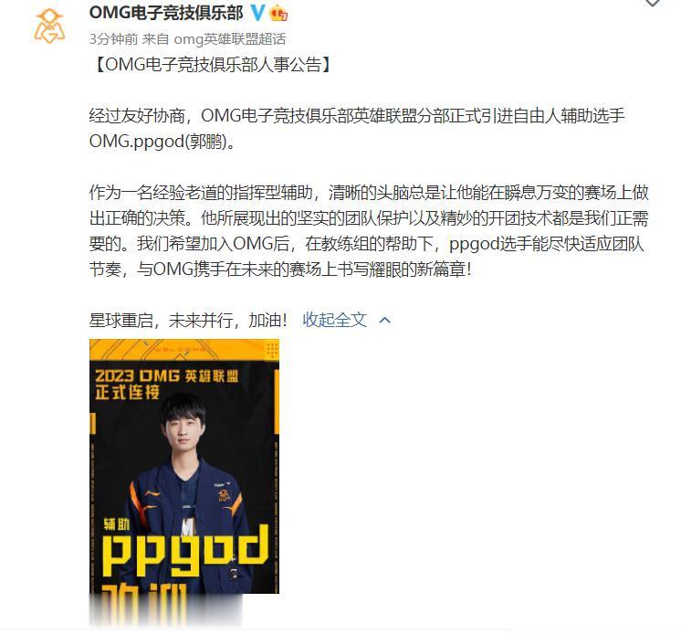 OMG官宣:辅助PPGod加入! OMG官宣了前V5辅助PPgod加入的消息,之前cold离队后,在德杯一直是Jerry首发,看来新赛季应该是PPGod顶替cold的位置了,不知道S13赛季的OMG能否会有进步的成绩呢?