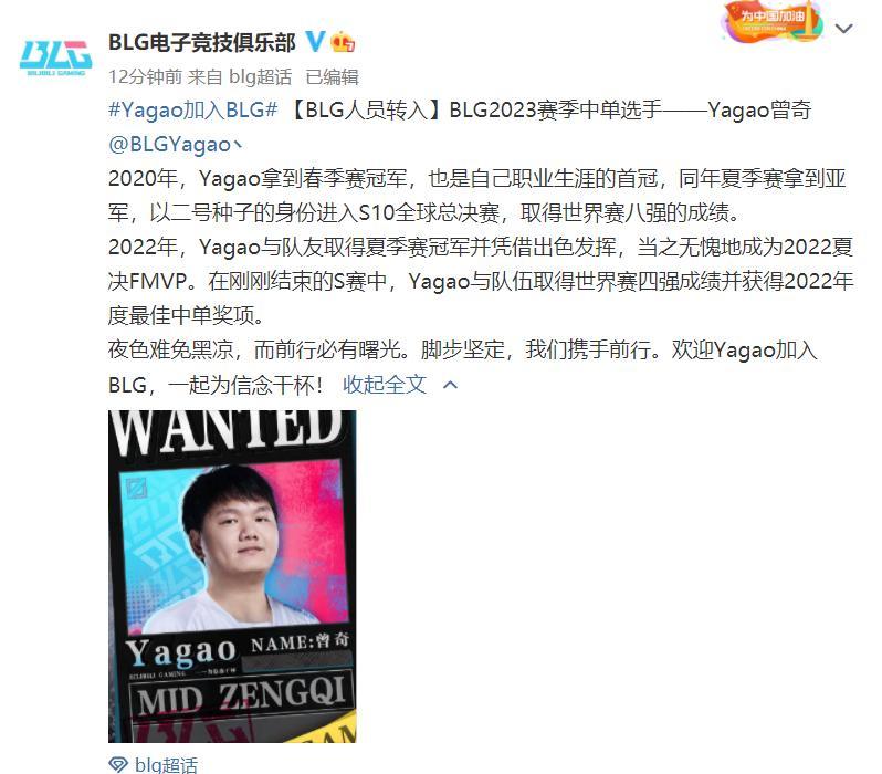BLG官宣牙膏加入! BLG官宣:前JDG中单牙膏加入,正如爆料中所说的一样,BLG买下了今年LPL夏季赛冠军中单,中路位置补强之后,希望BLG明年可以取得好成绩吧! 别再花大价钱,但是打不出成绩了,BLG也该出成绩了吧!
