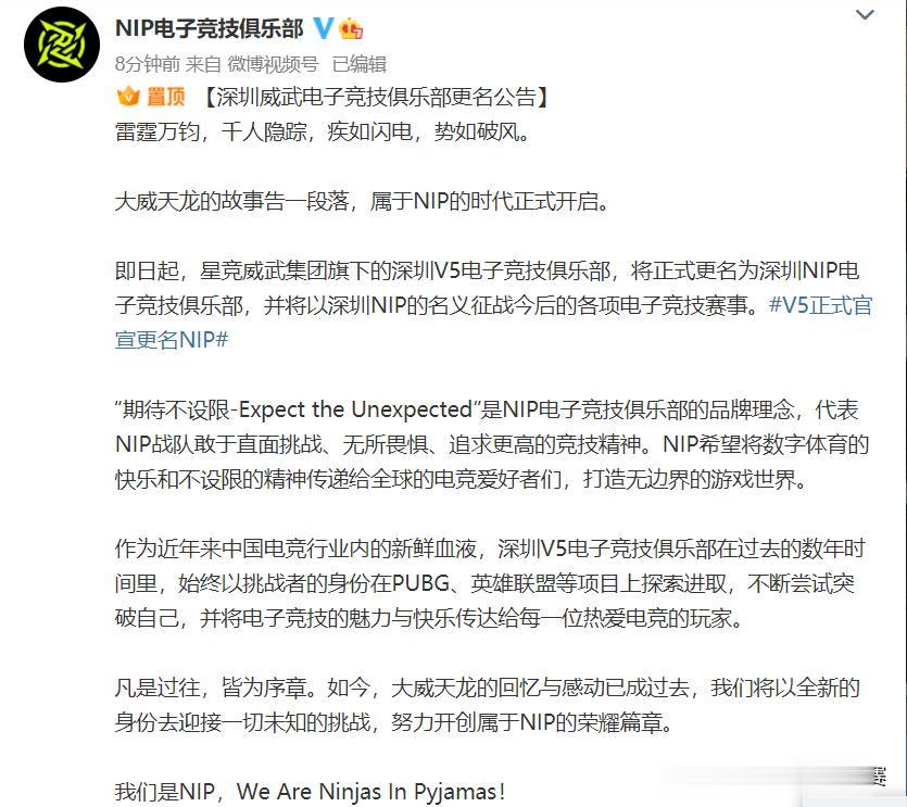 V5官宣:新赛季正式更名为NIP战队! 其实这个消息在外网已经传了很久了,前几天LPL官方发布的S13春季赛赛程安排中,也早已看不到V5的名字,只有NIP。 在NIP官宣之后,不少LPL俱乐部也赶来送上了祝福! 希望明年NIP可以取得好成绩吧!