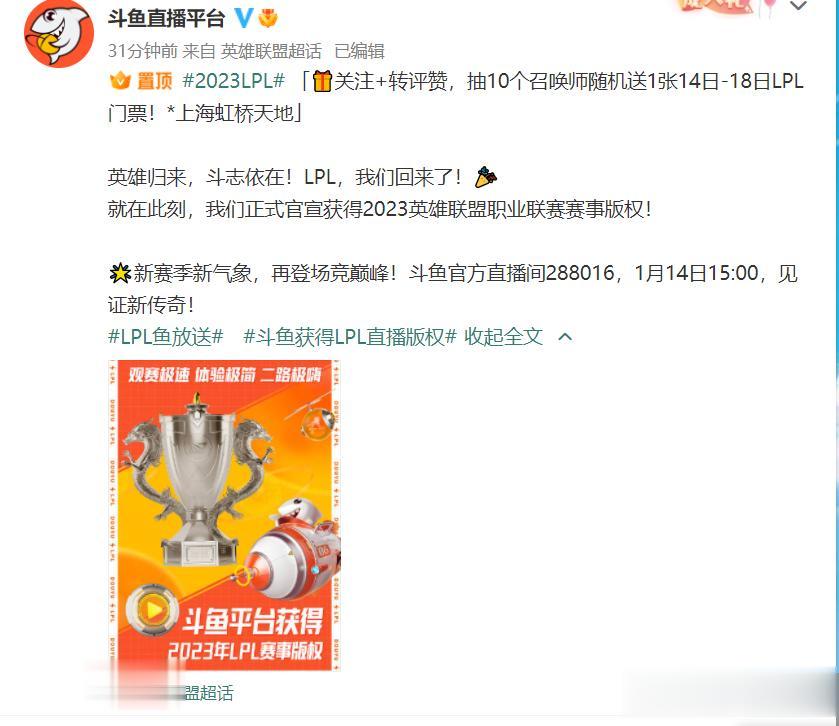 恭喜斗鱼!重新获得LPL转播权! 斗鱼在9号下午发文官宣:重获2023年LPL赛事直播版权! 很多斗鱼主播像是周淑怡、孙悟空、小伞、大鹌鹑等等都第一时间转发了,这也就意味着斗鱼二路也可以重启了!