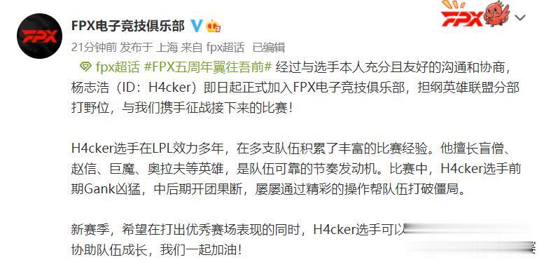 FPX官宣:打野hacker加入! FPX在27号晚上官宣了打野hacker加入的消息,估计是因为德玛西亚杯上,FPX被主播队暴打了,于是又进行了阵容的调整。 而评论区,很多FPX的粉丝都希望FPX再买一个辅助,不要让lwx明年春季赛玩得太难受,很多人建议买lvmao,估计是因为他在全明星的表现还不错。 那么,你们对于FPX买下Hacker一事,有什么看法吗?你们觉得明年FPX的成绩会如何呢?