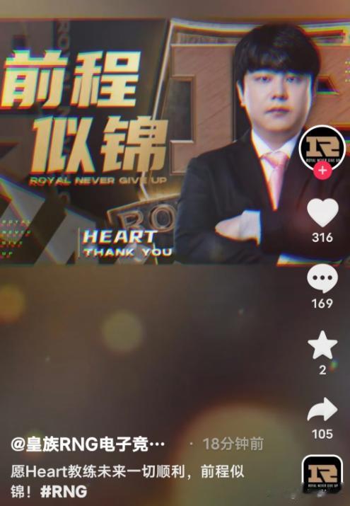 RNG官宣教练Heart离队! RNG在DY官方平台,宣布了教练heart离队的消息,而目前官博还没有任何消息。 虽然说RNG现在成绩不好,heart教练离队可以理解,但是来的时候没有正式官宣,走的时候DY官宣,RNG的运营真的很迷惑。
