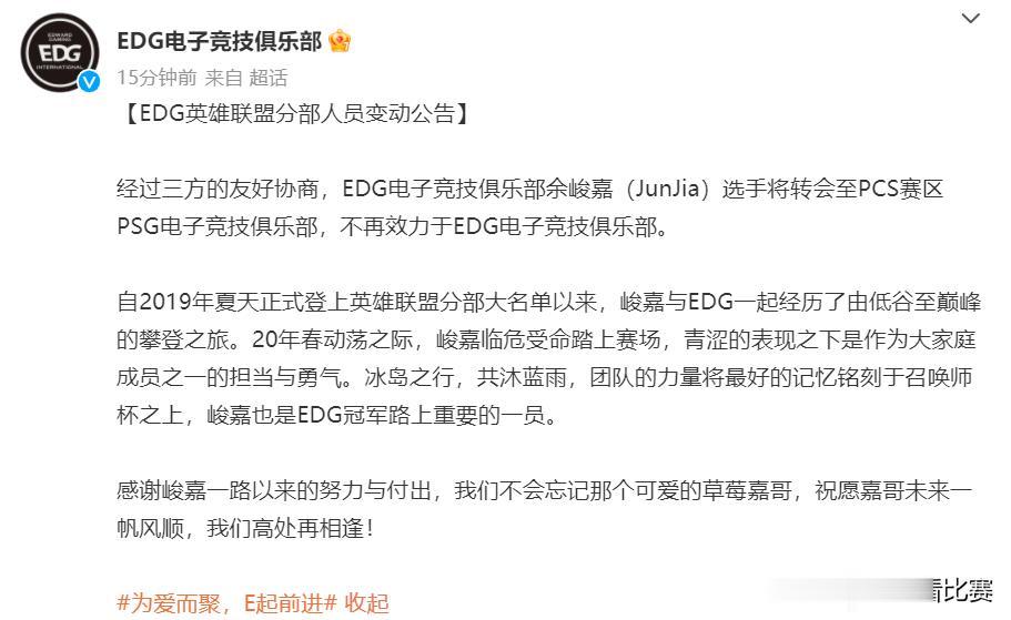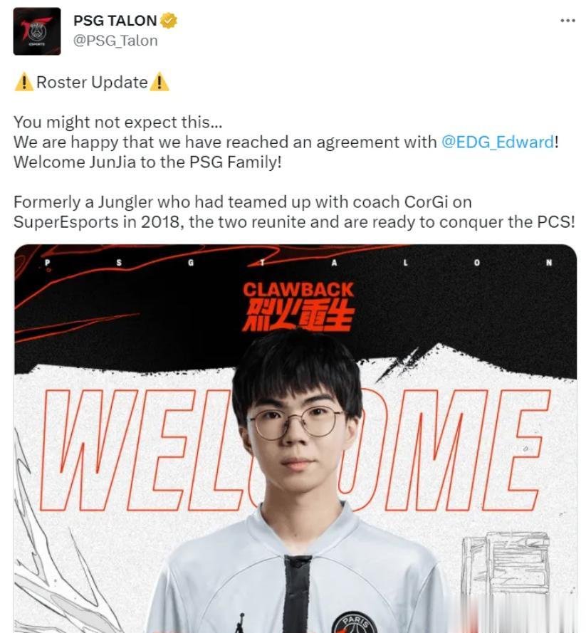 EDG官宣替补打野Junjia转会至PCS赛区PSG战队! 随后PSG战队也发布了官宣:欢迎Junjia选手加入PSG大家庭。 Junjia一直是韩服高分段打野,可惜比赛中一直没法打出Rank的实力,希望他在新的赛区和新的战队可以打出来吧,还能有比赛打就是好事。