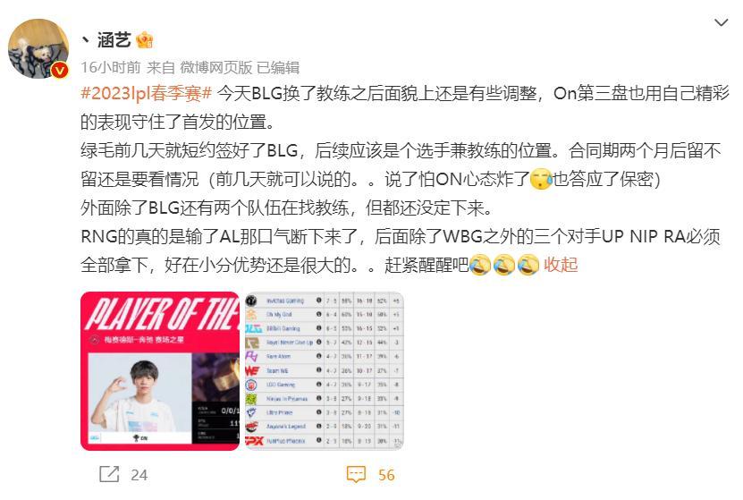 涵艺爆料:lvmao和BLG签了短期合约!选手兼教练! 前V5教练涵艺最近爆料:lvmao和BLG签了短期合约,应该是个选手兼教练的位置,合同期2个月,是否续约要看这两个月的表现。 在评论区涵艺也表示cryin有很多意向合同,还在选择,lvmao的短期合同和qiuqiu是一个性质。 难怪ON的机器人表现这么好,看来是有压力了啊。