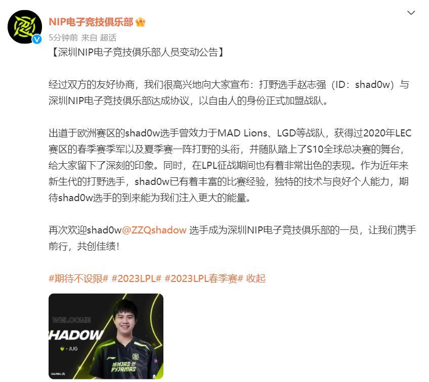 XLB凉了?NIP官宣:前LGD打野shadow加入! NIP在9号下午官宣了前LGD打野shadow正式加入的消。 XLB有替补了,shadow前期节奏还不错,但是中后期也很容易失误,只能说NIP在这个赛季成绩不佳,也只能想办法去一点点调整了。