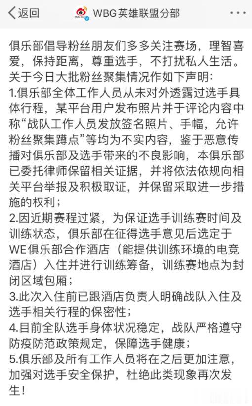 WBG官博发声:希望粉丝尊重选手,保持距离! WBG在西安备战和WE的比赛,但是前一天在网吧训练的时候,被粉丝现场Gank,要签名合影,甚至还有直播的,而且WBG队员们入住的酒店也有粉丝蹲点。 之后WBG官博发声,表示:并非是战队工作人员泄露了队员的训练地址和酒店地址!而且明令禁止任何打扰选手训练生活的私生行为。 只能说真成饭圈了,开始追星那一套了,这种还是远离电竞圈吧!