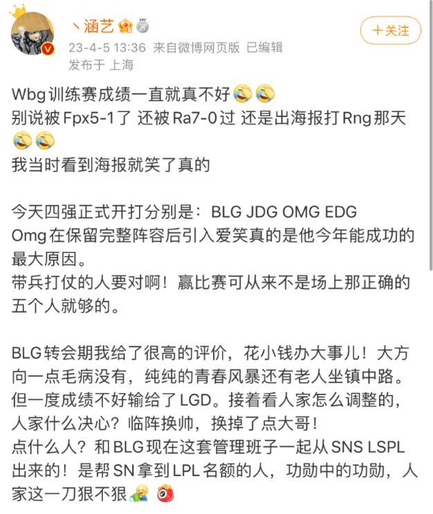涵艺爆料:WBG不仅训练赛被FPX打了5-1,还被RA7-0 在lwx直播爆料FPX在训练赛暴打WBG,战绩5-1之后,WBG老板震怒,嘲讽lwx是倒数战队的选手,故意碰瓷。 随后前V5教练涵艺爆料:在训练赛中,WBG不仅被FPX5-1,还被RA打了个7-0。 其实RA这支战队前期真的还可以,就是喜欢中期送波大的,而doinb爆料WBG每场训练赛只有几分钟,不到十分钟,估计就是前期炸穿了。只能说夏季赛的WBG危险啊,好好调整吧!