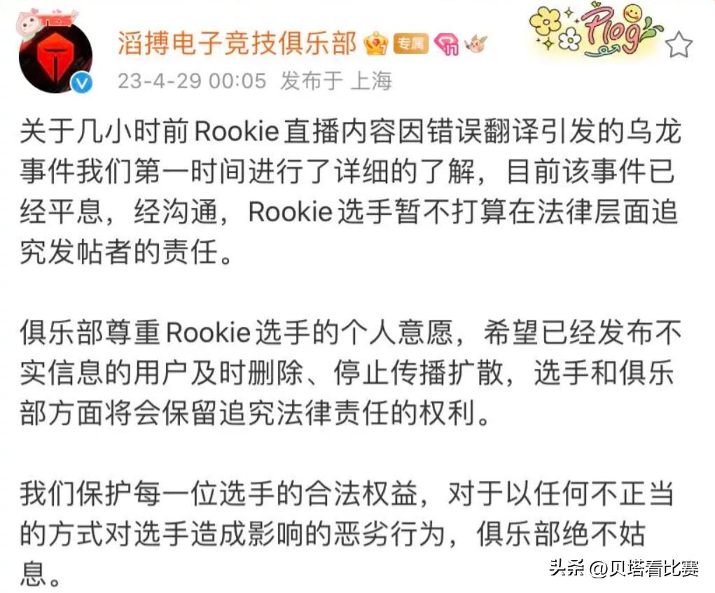TES回应Rookie谣言:Rookie暂不打算在法律层面追究责任! 因为错误的翻译,让很多人以为Rookie在有女友的情况下还想要去乱搞,之后正确版本翻译出来后,发帖者也第一时间道歉。 而TES官博则是在稍后发布了正式声明,表示Rookie暂不打算在法律层面追究责任,俱乐部尊重Rookie选手的个人意愿。