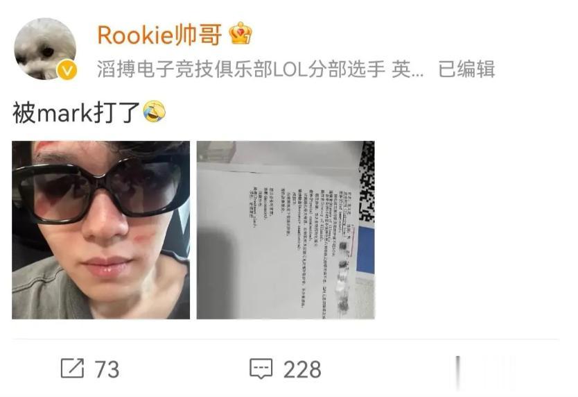 Rookie面部受伤了! Rookie发微博晒出了自己面部多处受伤的照片,和病历单,并且调侃:被mark打了。 随后TES官博和女友小钰都留言吐槽Rookie是下楼梯看手机导致自己摔伤了,医院的诊断书上也写着不慎摔伤导致。 只能说早日康复吧,真要注意点了。
