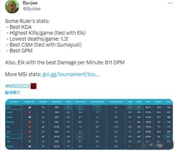 Ruler五项数据位列MSI所有选手第一! 外媒最近统计了Ruler的数据,发现KDA、场均击杀、场均阵亡、分均补刀以及分均经济,都是本届MSI所有选手中的第一位。 值得一提的是分均伤害最高的是BLG的ELK,数据是811。