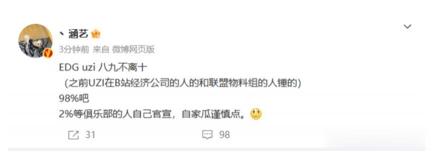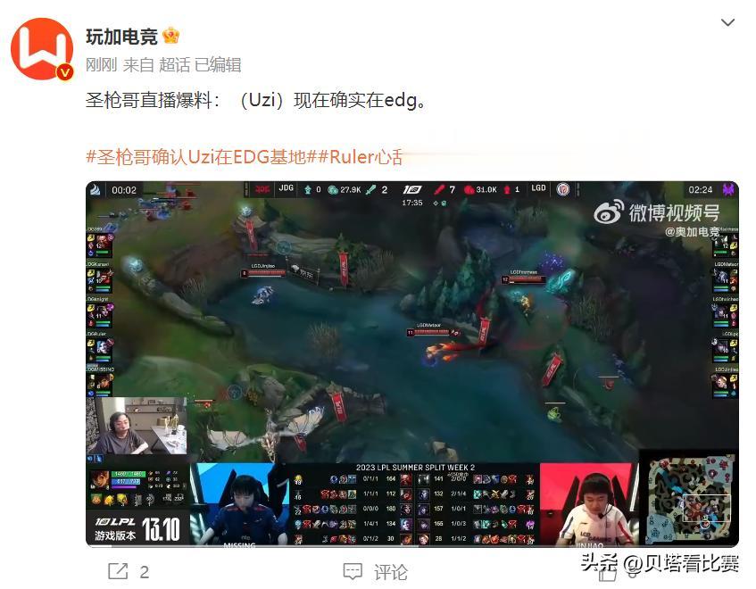 957爆料:Uzi确定去EDG!圣枪哥爆料:他现在人在EDG! 自从多位圈内人爆料Uzi要去EDG之后,几位前职业选手也回应了。 957直播爆料:Uzi确定去EDG,这种消息自己不会乱爆料的。 而圣枪哥也直播中透露:Uzi现在人就在EDG。 另外涵艺也透露:Uzi加入EDG的概率有98%。
