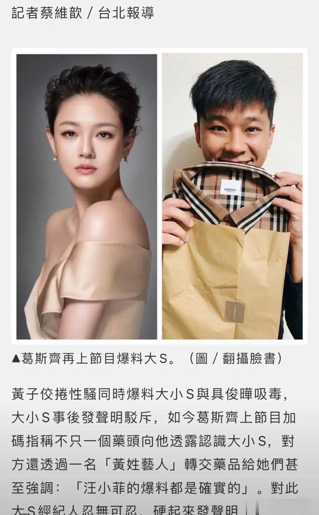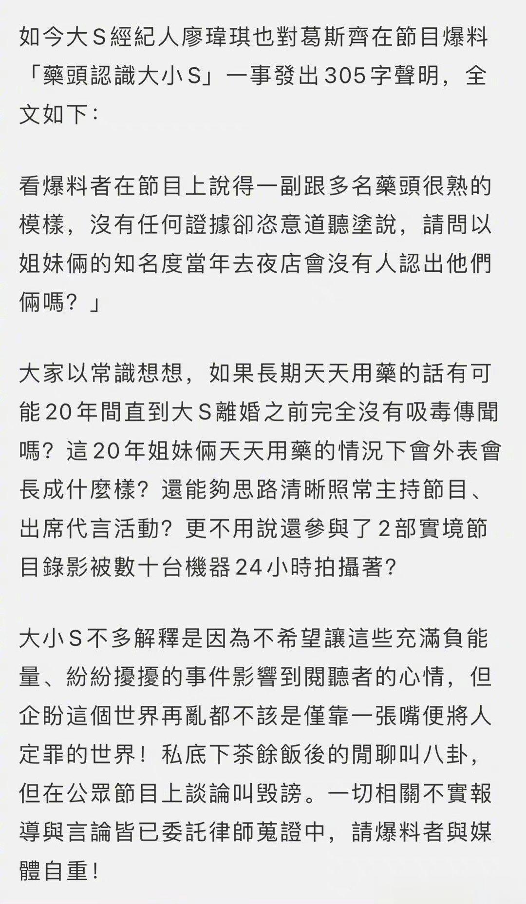 #大S经纪人发声明#葛斯齐上节目爆料药头认识大小S的,大S经纪人廖玮琪通过台媒发声明,怒斥传闻不实,并表示已委托律师搜证!