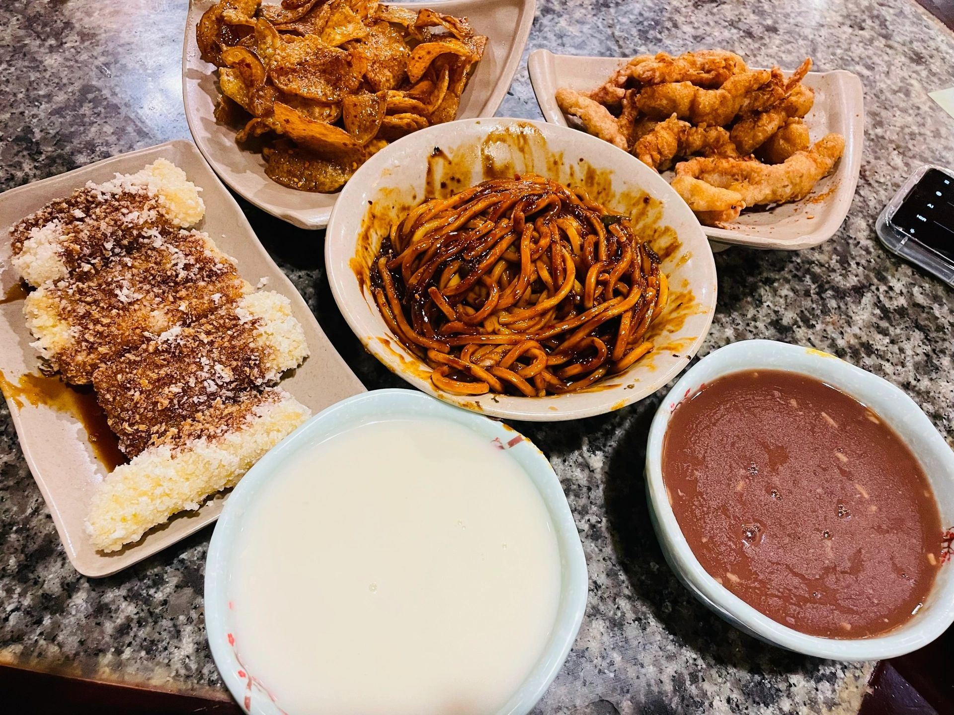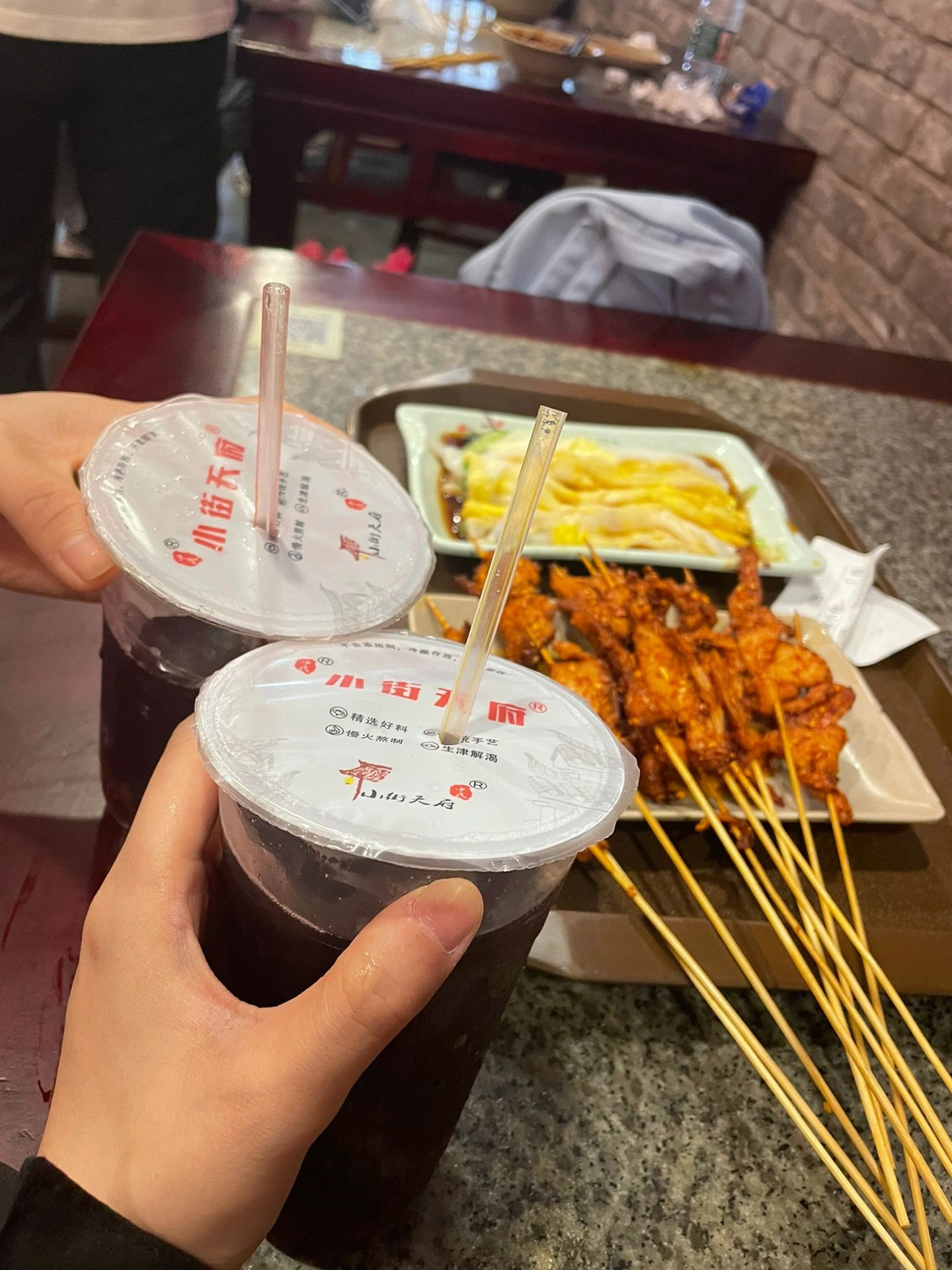 点了酸梅汤、肠粉、里脊肉串、担担面、土豆片、小酥肉、美玲粥、酒酿赤豆元宵。