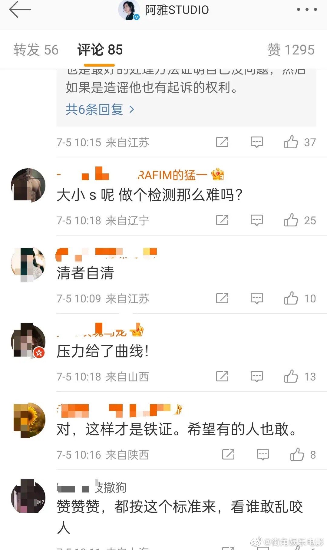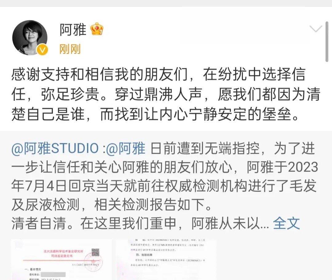 #阿雅毛发及尿液检测报告#阿雅工作室晒出了阿雅毛发及尿液检测报告后,许多网友夸赞阿雅做的好,还自己一个清白,希望一些艺人都按这样流程办,之后有网友提问“大小S做个检测有这么难吗?”也有网友表示,阿雅带了个好头,压力给了曲线。