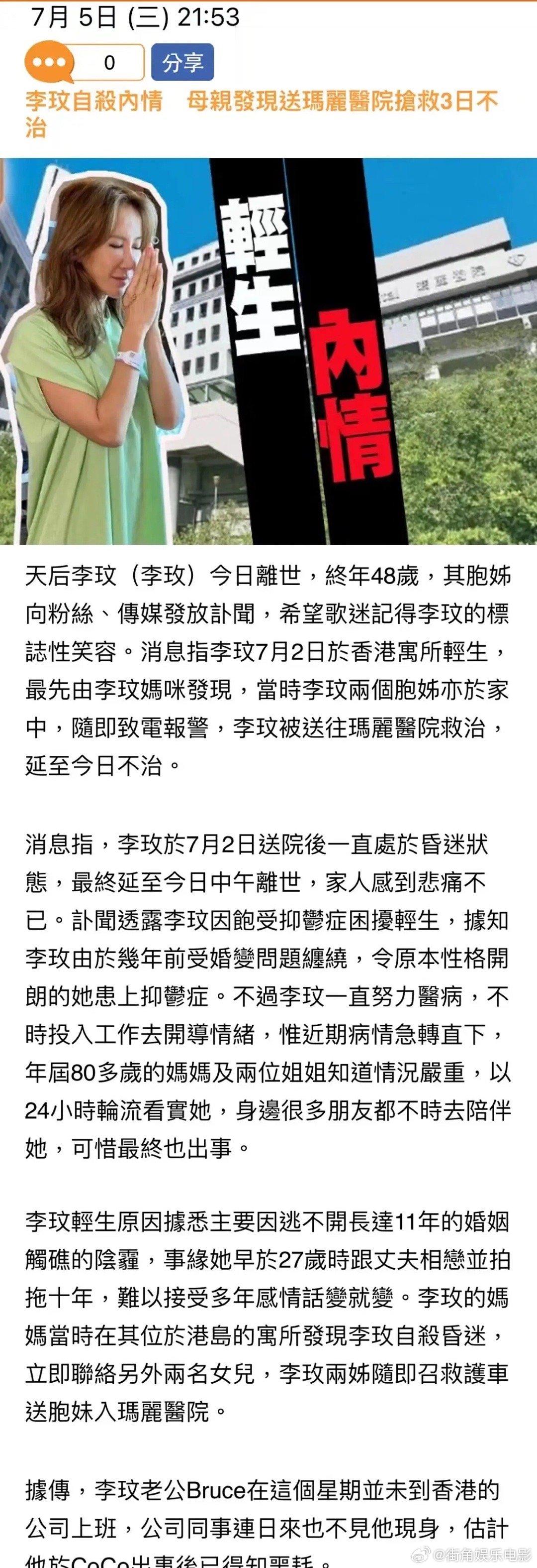 #李玟80岁母亲首先发现女儿在寓所轻生#李玟去世细节曝光!母亲最先发现李玟出事,她老公到现在还没出现!李玟是在香港家中轻生,她80岁的母亲第一时间发现女儿出事,两个姐姐也在家,马上就把李玟送到医院。