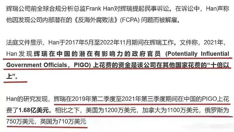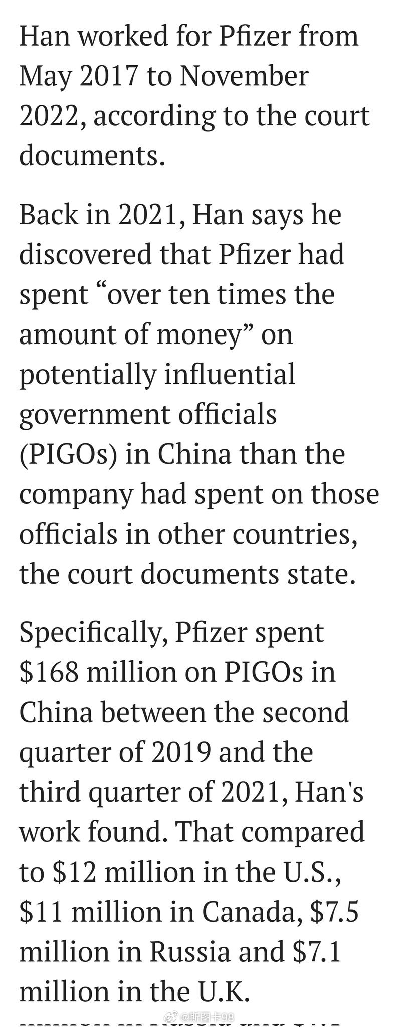 前辉瑞全球合规总监Frank Han被辞退,为了报复,向司法部实名举报当初辉瑞公司在疫情期间为让辉瑞的药物和疫苗打入中国市场. 在2019年II-21年III季度之间辉瑞向中国有潜在影响力官员支付了1.68亿美元。高于其它国家的十倍。