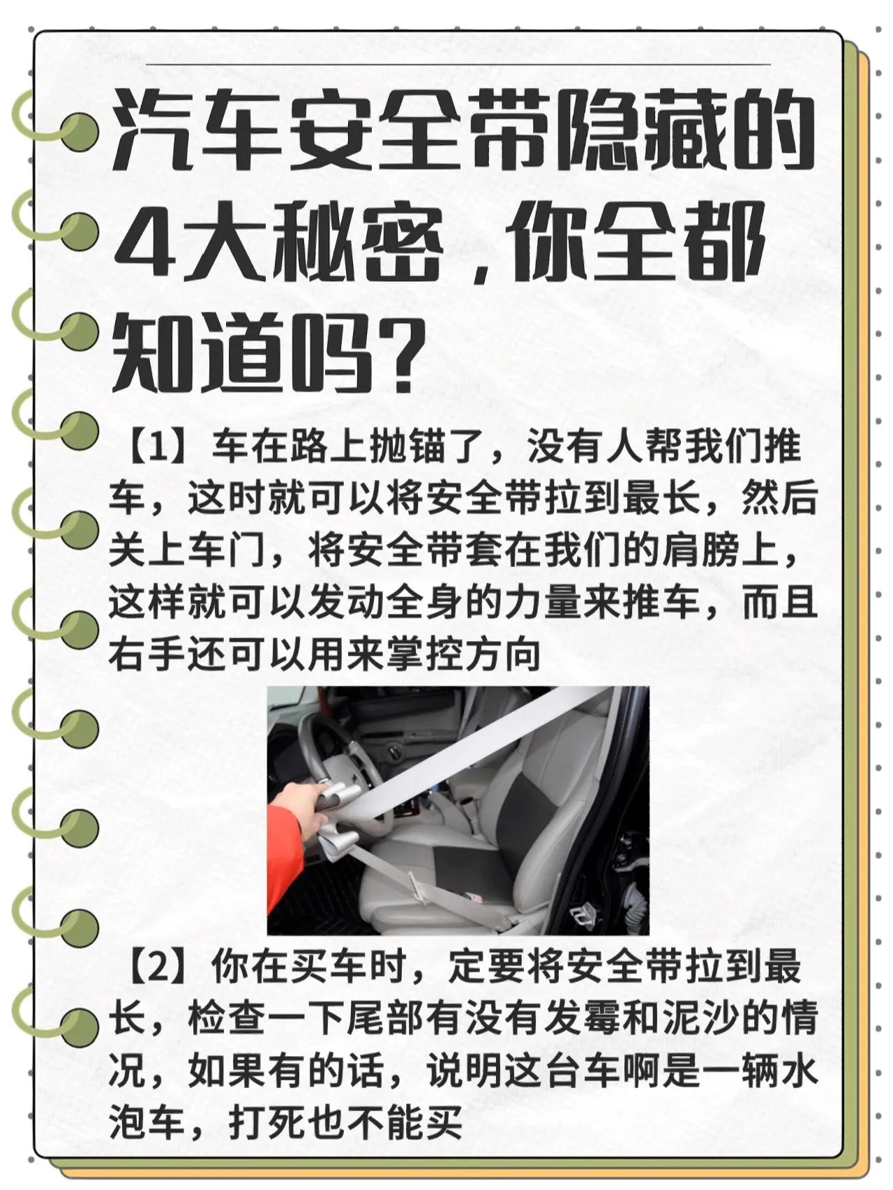 教你如何在路上抛锚自救,同时避开水泡车!你在路上行驶时,如果突然车辆抛锚了,怎么办呢?而且,你又该如何避开那些水泡车呢?这里提供了一些小技巧来帮助你完成这些挑战。 首先,如果你的车抛锚了,没有人来帮你推车,这时你可以将安全带拉到最长,然后关上车门,将安全带套在你的肩膀上,这样你就可以发动全身的力量来推车,同时右手可以用来掌控方向,从而把车推到安全的地方。 其次,当你在购买汽车时,一定要把安全带拉到最长,检查一下尾部是否有发霉和泥沙的情况。如果有,则这台汽车就有可能是一辆水泡车。坚决不要购买这样的汽车,否则将会面临很多麻烦和修车费用。 最后,购买汽车时,也一定要检查安全带上的生产日期,因为安全带的寿命一般为10年左右。如果你买到了超过寿命的安全带,那么它将不再保证你的安全。所以我们要仔细地检查并选择延长寿命的安全带。 以上就是一些小技巧,让你在面对车辆抛锚时能够自救,并且在购买汽车时能够避开水泡车。希望这些小贴士能够帮助到你。