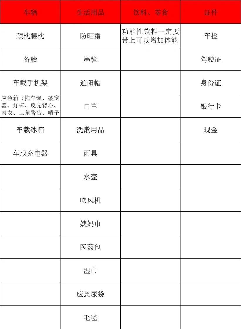 自驾游必带,让你出发不愁 自驾游是近年来备受旅游爱好者追捧的一种旅行方式。在自驾游中,除了车辆本身,在准备旅行过程中所需的各种用品也至关重要,因为这一点稍有不足就会影响你的旅游体验,甚至可能带来不必要的麻烦。所以,在这里分享自驾游必带的物品合集,让你出发不愁。 车辆必备: 随着自驾游的流行,各种车载必备用品应运而生。在这里我们推荐你带上以下几种: 1. 颈枕和腰枕:在行车中可以帮助你调整坐姿,减轻疲劳。 2. 备胎:意外情况时备胎可以让你在短时间内快速解决问题。 3. 车载手机架:方便行车途中使用手机导航或听音乐。 4. 应急箱:包含物品有拖车绳、破窗器、灯棒、反光背心、雨衣、三角警告、哨子等,为你提供安全保障。 5. 车载冰箱:为旅途中提供冷藏、保鲜服务。 6. 车载充电器:保证各种设备电力充足,免去被“掉电”的尴尬。 生活用品: 自驾游需要面对更加严峻的户外环境,所以一个好的出行准备也是非常必要的。 1. 防晒霜和墨镜:夏季防晒和护眼必备品,为肌肤和眼睛提供全面保护。 2. 遮阳帽:防晒的同时,可以帮助减轻眩光。 3. 口罩:多种场景下都可能用到,为你提供安全保护。 4. 洗漱用品:常用的牙刷、牙膏、洗面奶等。 5. 雨具:雨伞、雨衣、雨鞋等,各种下雨情况应对。 6. 水壶:随时补充水分。 7. 吹风机:女性朋友们可以使用,便于旅途中打理发型。 8. 姨妈巾:女性必备,避免不必要的尴尬。 9. 医药包:药品、创口贴等,为应对各种突发状况提供应急措施。 10. 湿巾和应急尿袋:旅途中遇到没厕所的情况时,非常实用的点睛之笔。 11. 毛毯:夜间睡眠时保暖使用。 12. 饮料、零食:可以选购一些功能性饮料、营养快线等,提供补充体力的效果。 证件: 除了车辆和生活用品之外,证件的准备必不可少,如驾照、行车证、身份证、银行卡、现金等,必须清楚明了地放在安全的地方。万一必要情况下,证件才是你顺利旅行的敲门砖。 随着自驾旅游的风靡,自驾游必备物品的种类和数量也在逐渐增多。但最核心的原则仍然是“适合自己的才是最好的”。所以,在准备物品前先考虑自身需求,再结合出游地点、季节等因素进行选择。