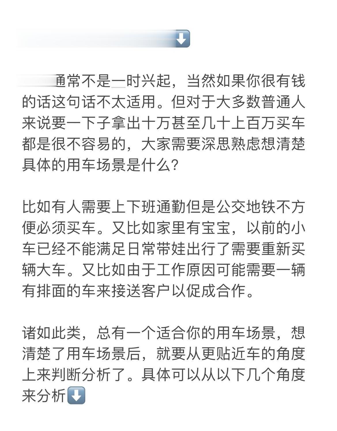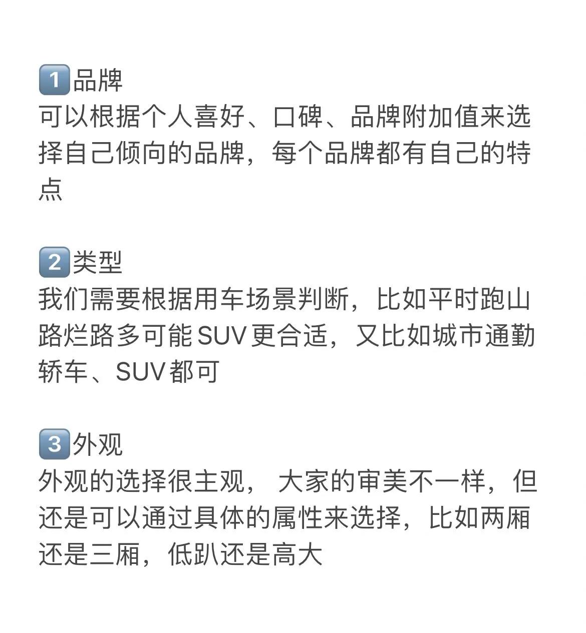 打造个性化的座驾,如何选购适合自己的车?今天就来跟大家分享一下如何选购适合自己的车,打造个性化的座驾! 首先,要确定买车的具体使用场景,比如通勤、载人载物等,这决定了车的类型、空间等需求。其次,要根据自己的口味选择品牌、外观、内饰等,满足个性化需求。接下来,就要考虑操控、动力和安全性等方面,选择适合自己的车型。同时,还要根据自己的日常使用习惯选择配置和能源类型。 具体来说,可以从以下几个方面入手: 1. 确定使用场景:通勤、载人载物等。 2. 选择合适的品牌:可以根据个人喜好、口碑、品牌附加值等因素。 3. 根据用车场景选择类型:城市通勤可以选择轿车、SUV等,跑山路烂路多可以选择SUV等越野车。 4. 外观风格选择:可以根据喜好选择两厢还是三厢、低跑、高大等属性。 5. 内饰选购:可以根据个人喜好选择简约、豪华、科技感等风格。 6. 操控和动力:可以根据运动还是舒适的需求选择不同的车型。比如追求速度的可以选择加速更快的跑车,而追求舒适的可以选择轿车。 7. 安全性考虑:可以根据安全参数选择气囊数量、侧气帘等配置比较齐全的车型。 8. 空间的需要:可以根据平时大多数时间的用车情况来选择空间需求,比如平时都是一人,空间不用那么大。 9. 配置方面:可以跟根据自己的需求选择需要的配置的车型比如需要自适应巡航、360度倒车影像等。 10. 能源选择:可以根据便利性以及后期维护成本来考虑自己适合哪种能源类型, 油车、纯电车、混动车都有不同选择。 以上这些方面就是选购车辆需要考虑的,我们可以根据自己的实际情况和需求,做出个性化的选择,打造适合自己的出行方式!