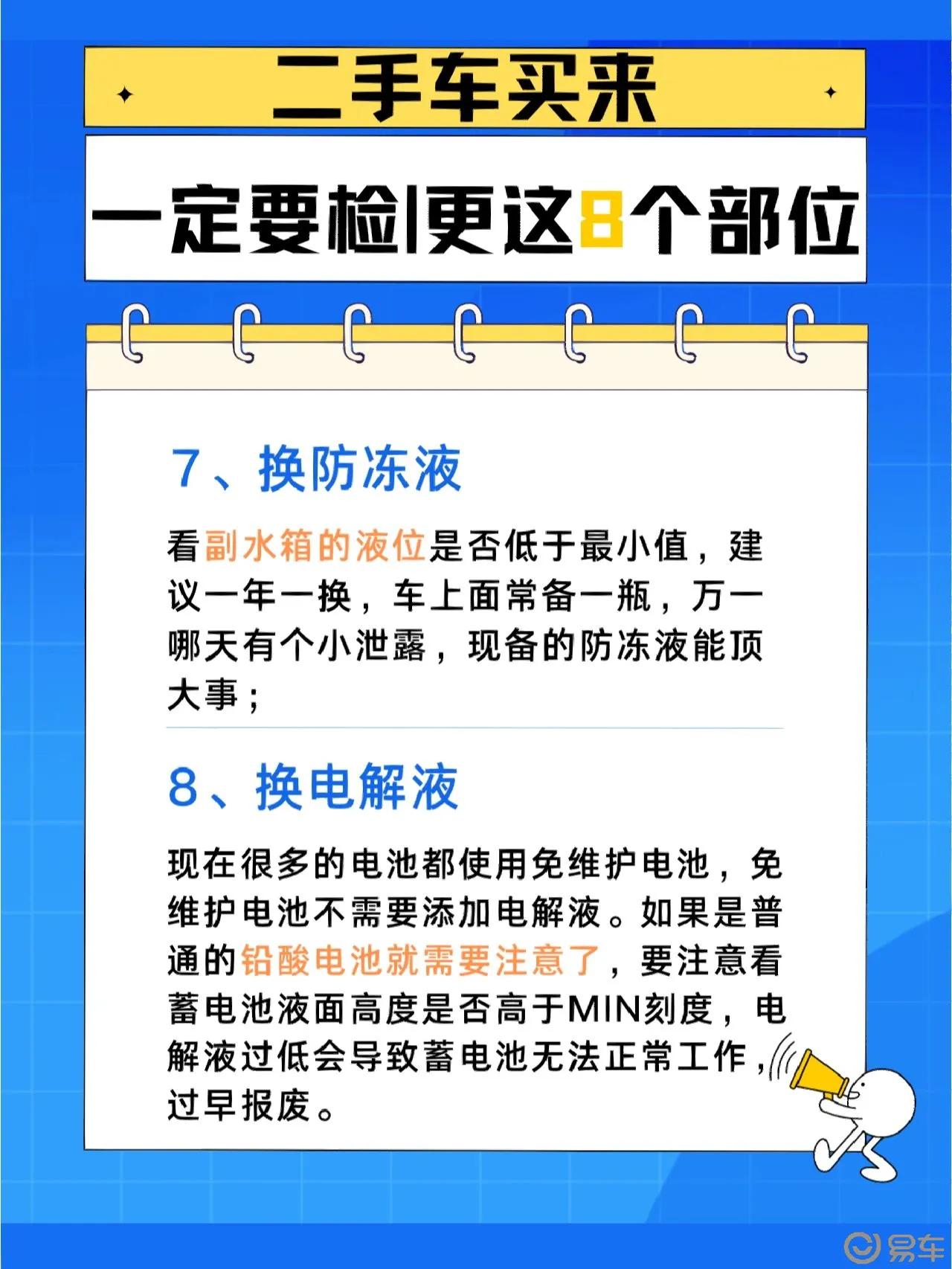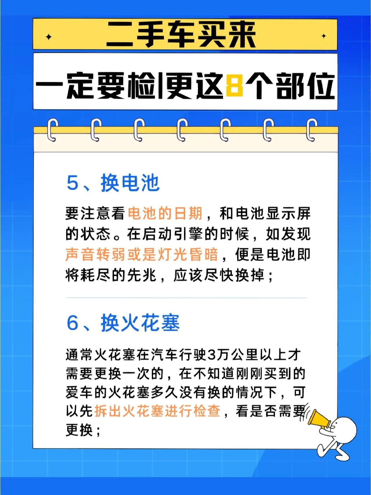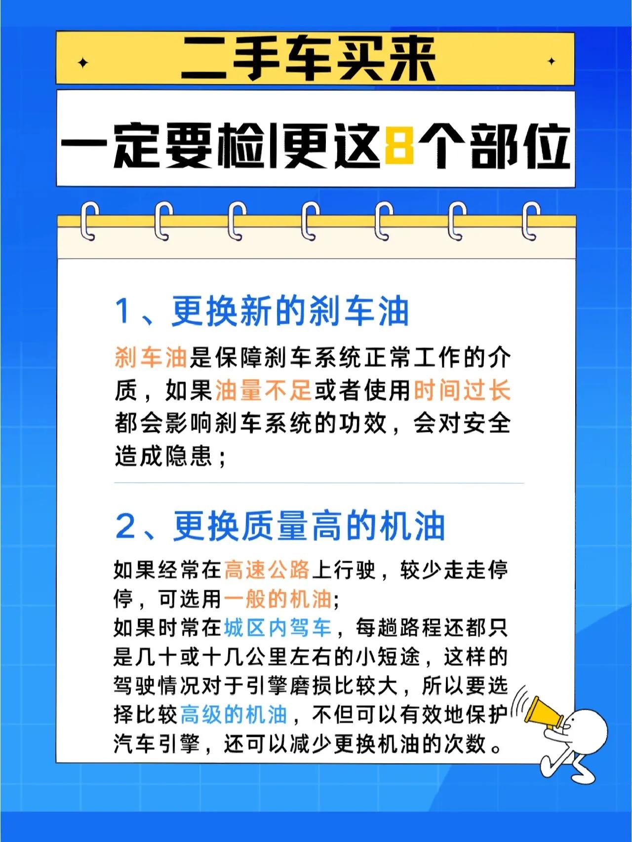 二手车入手必须更换这8部件,不要忽视! 刚拿到手的二手车,不要急着上路。为了保障自身安全,还是需要做出一番检查和保养工作的。其中就需要更换以下8个部件: 1、 刹车油:刹车油是刹车系统中非常重要的液体,其随着时间和使用,其性能会逐渐降低,建议更换新的刹车油。 2、 机油:更换质量高的机油可以确保发动机的正常运转,增加二手车的可靠性,买回来后尽快更换。 3、 变速箱油:变速箱油也是车辆需要定期更换的油液之一,如果购买车辆时没有明确更换时间,需要做出更换的判断。 4、 空气滤清器:车辆的空气滤清器也需要定期更换,这样才能保证车辆的燃油效率和有效性。 5、 电池:电池也是只有在购买二手车的时候才能真正检查其使用时间,如果时间过长,建议更换一个新的。 6、 火花塞:如不及时更换,火花塞会逐渐磨损,加重二手车的轻质化,推荐及时更换。 7、 防冻液:防冻液的更换非常重要,如果防冻液不足或者质量不佳,会导致车辆故障或者其他的不良反应。 8、 电解液:电解液的更换可以保护车辆的电器系统,定期更换可以延长电器系统的使用时间。 以上8种部件的更换虽然会增加一些成本,但对于二手车的维护和使用非常重要。购买二手车除了了解车辆的情况外,更要做好检查和维护工作,这才能保障自身的安全。