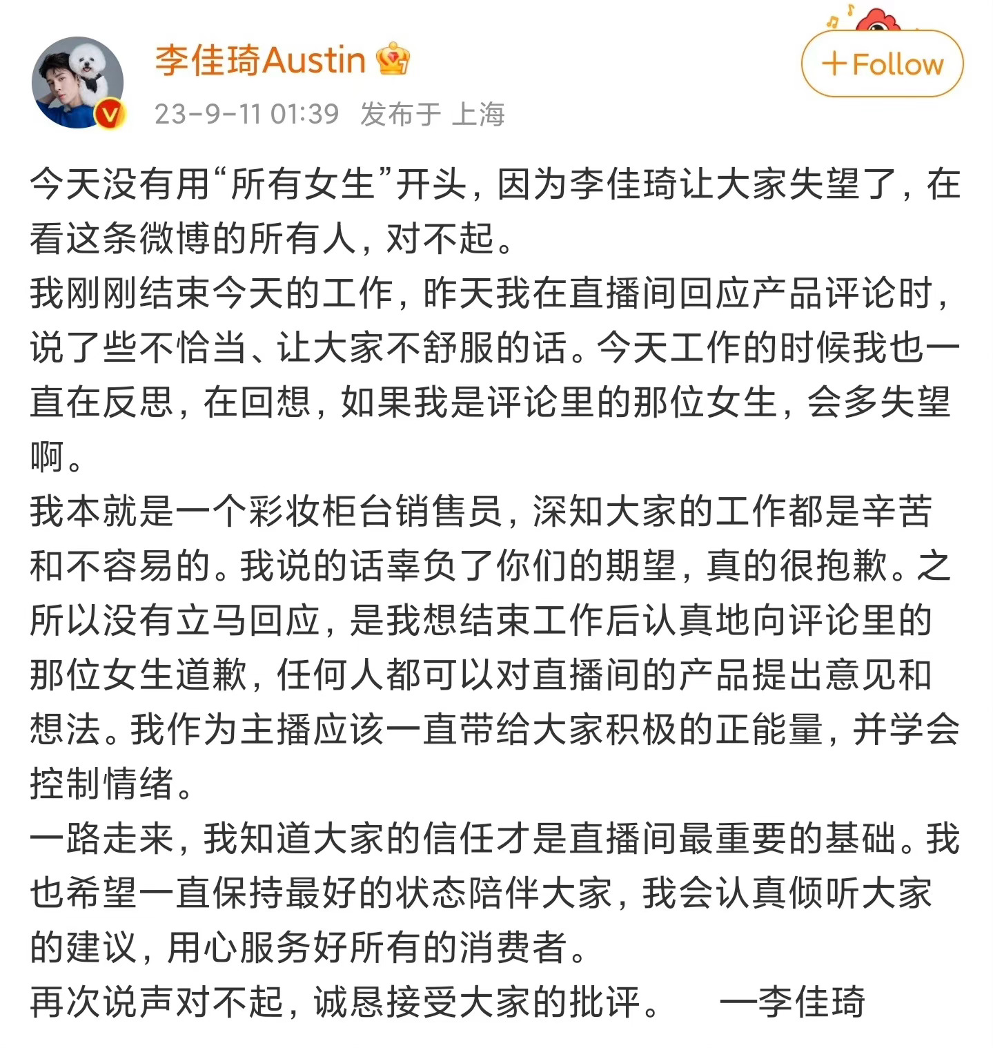 李佳琦最新评论,不再有网友帮他说话#李佳琦就直播言论致歉#