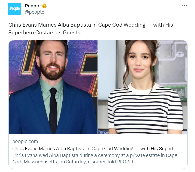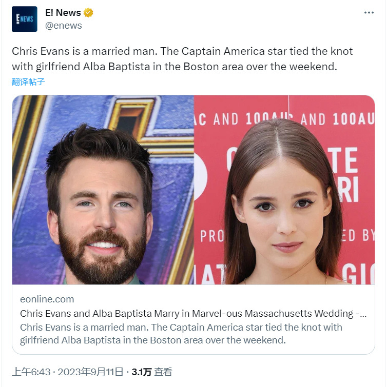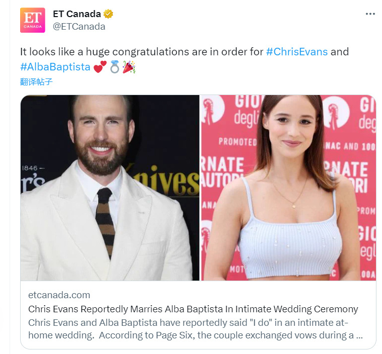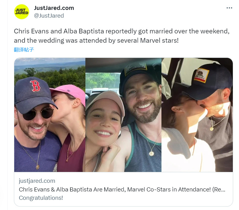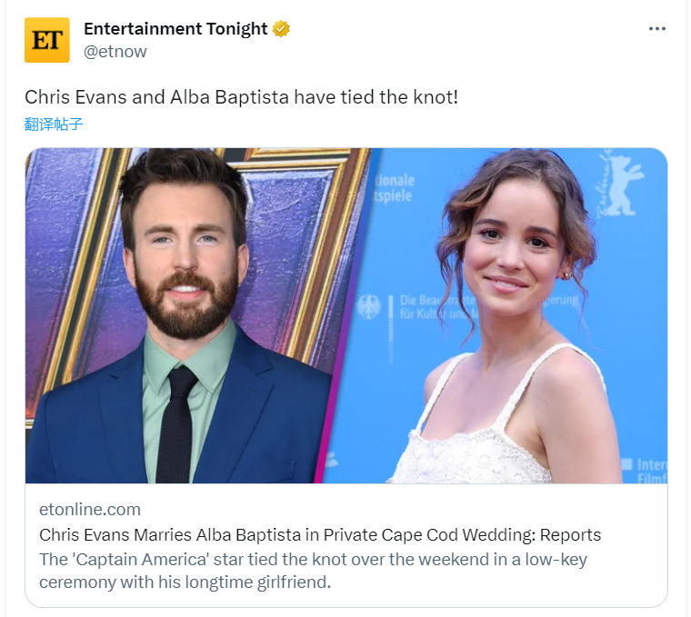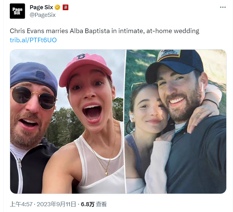 42岁的克里斯·埃文斯和26岁女友Alba Baptista周六在家中结婚!#美