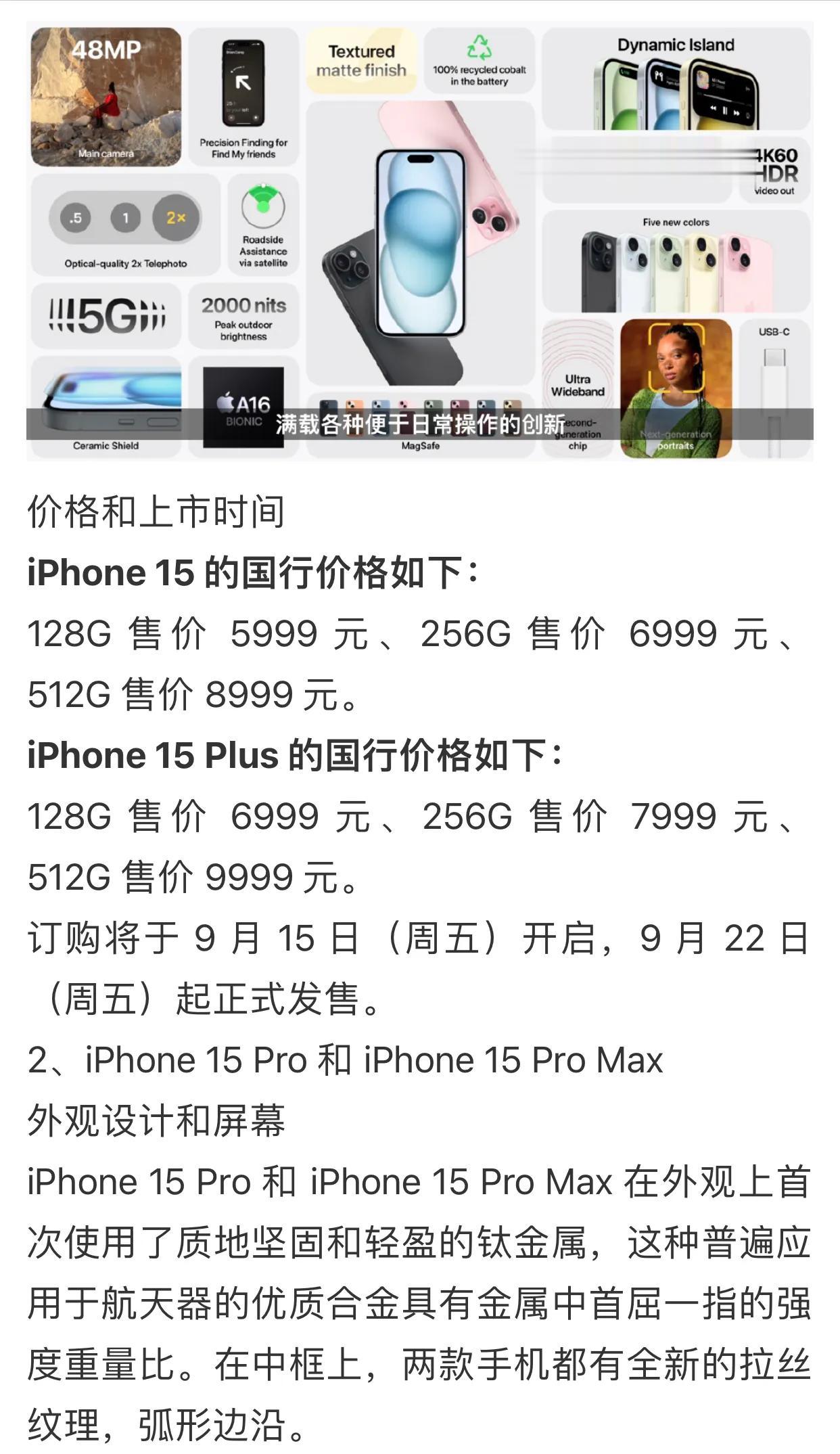 北京时间9月13日凌晨,苹果召开了“好奇心上头”的秋季新品发布会,本次发布会最受关注的莫过于全新 iPhone 15 和 iPhone 15 Pro 系列新机的发布,此外还有新款 Apple Watch Series 9 和 Apple Watch Ultra 2 等等。这次 iPhone 15 和 iPhone 15 Plus 都采用了 USB-C 端口,意味着同一根连接线现可为 iPhone、Mac、iPad 以及更新后的 AirPods Pro(第二代)充电。iPhone 15 Pro 和 iPhone 15 Pro Max 在外观上首次使用了质地坚固和轻盈的钛金属,这种普遍应用于航天器的优质合金具有金属中首屈一指的强度重量比。在中框上,两款手机都有全新的拉丝纹理,弧形边沿。此外,在 iPhone 15 Pro系列中,静音拨片退出舞台,改用 Action 按钮。Action 按钮的操作类似于 Apple Watch Ultra,用户根据可以自己的偏好,来启用相机、录屏、打开笔记应用或者指定打开某款 App,自然用户也可以将其设置为静音开关,切换铃声 / 振动模式。