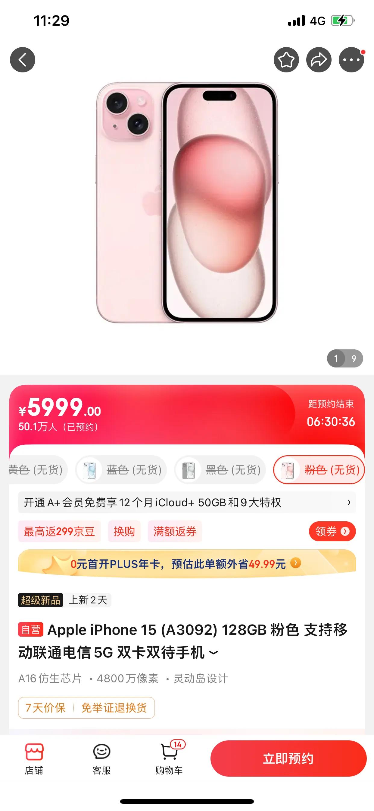 2023年9月15日上午11点30分苹果京东预约294.4万台。