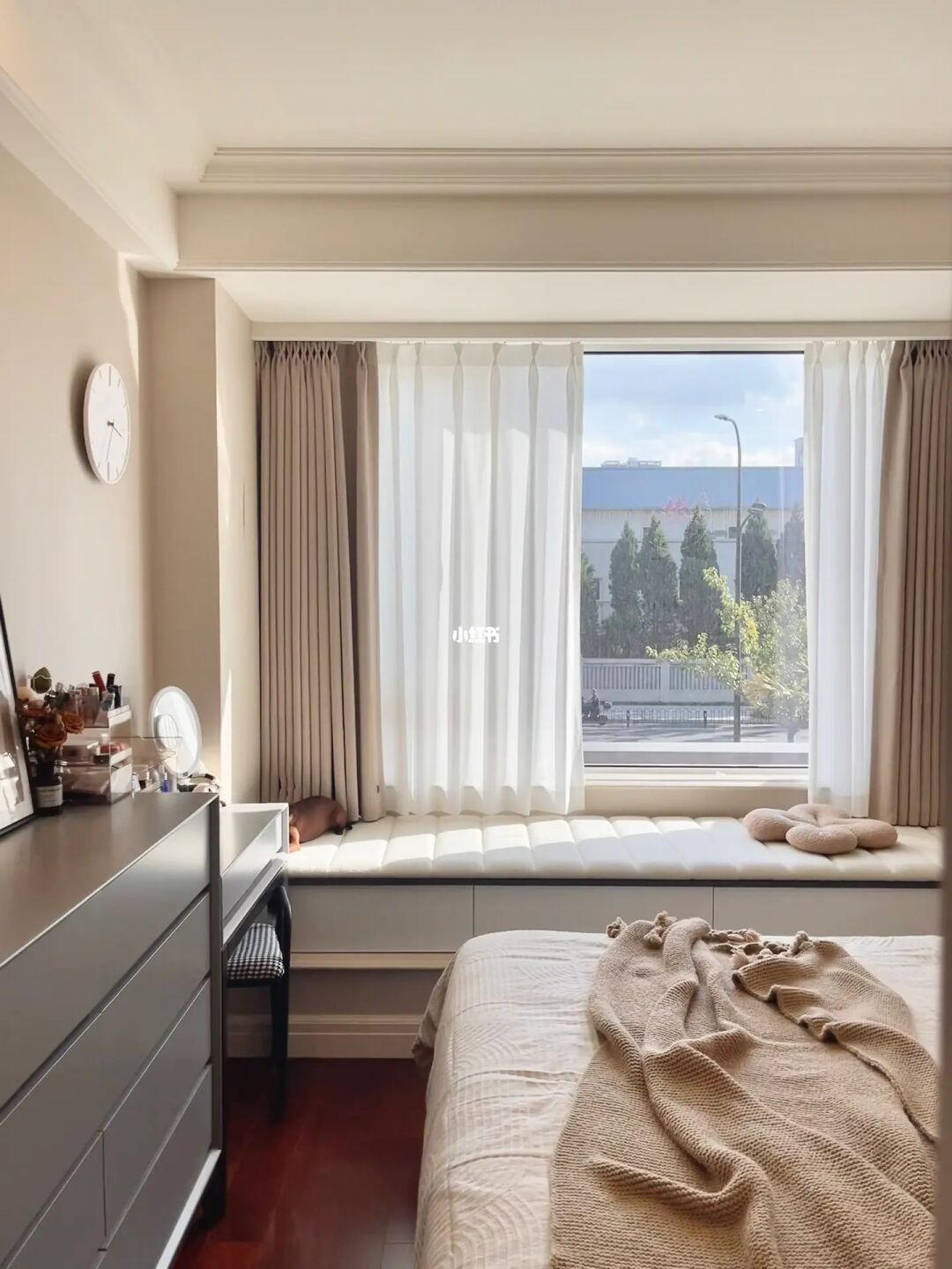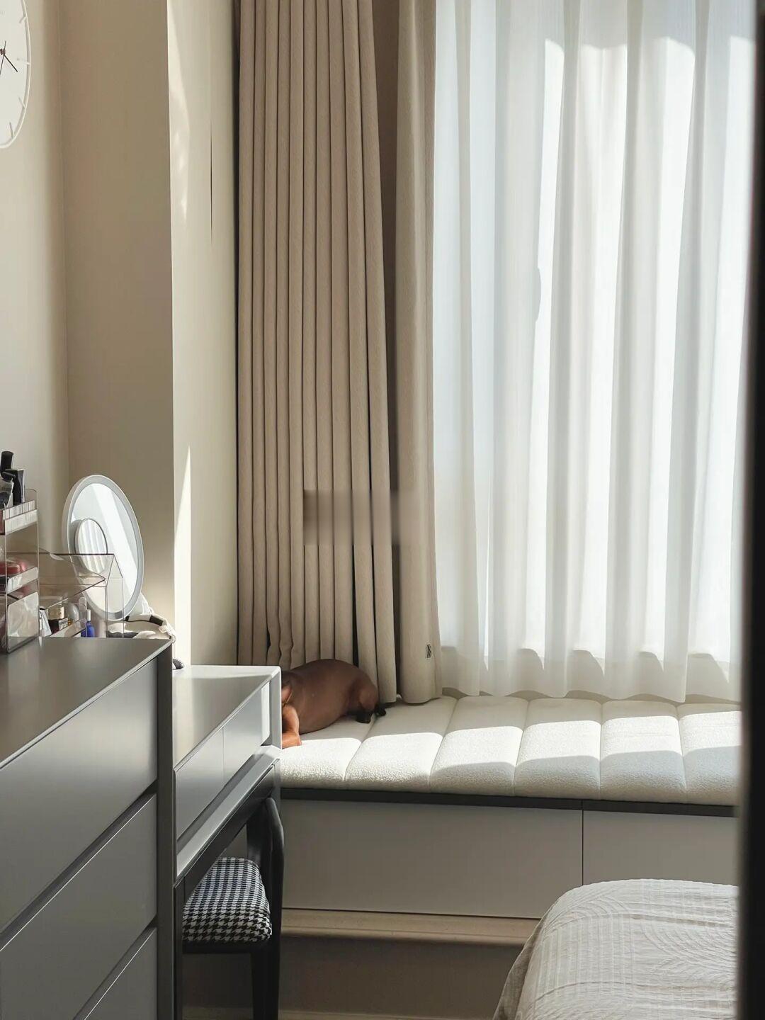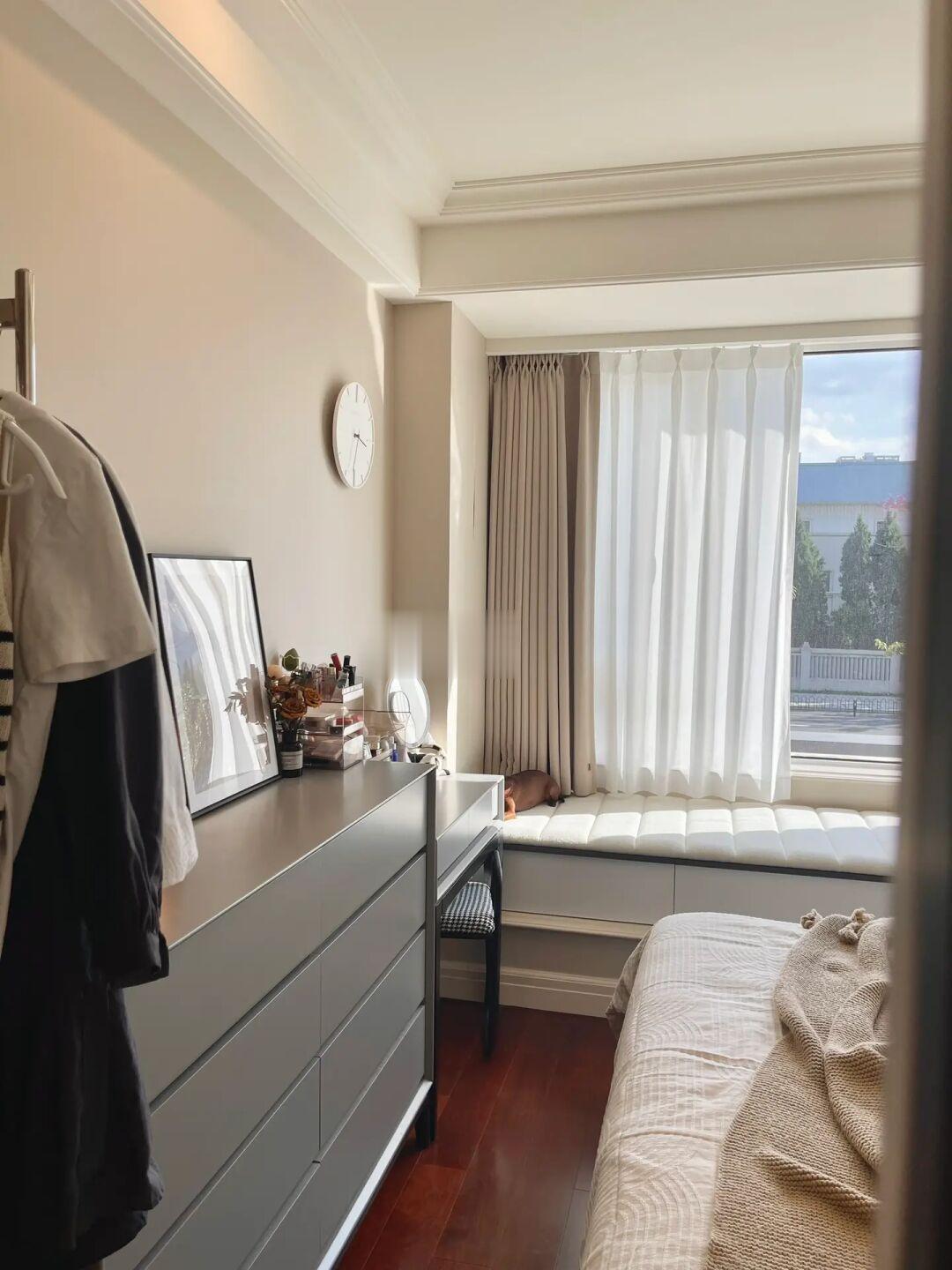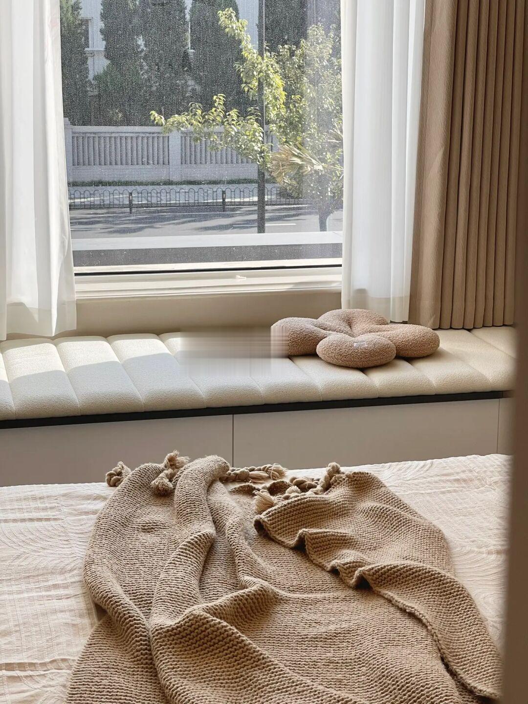 ▫️尺寸:如果像我家窗帘在飘窗上方,记得预留定制飘窗柜和飘窗垫后的高度~
