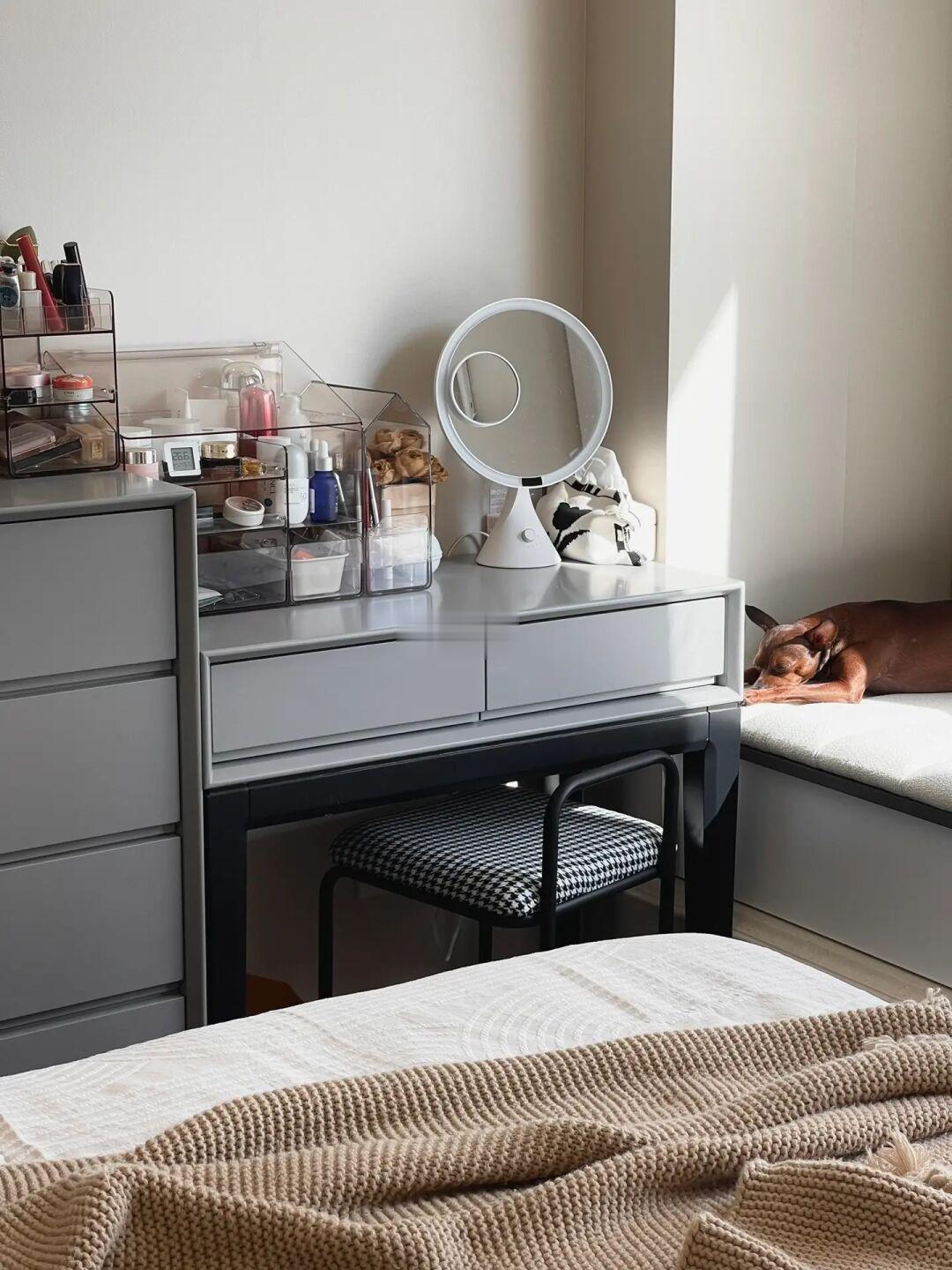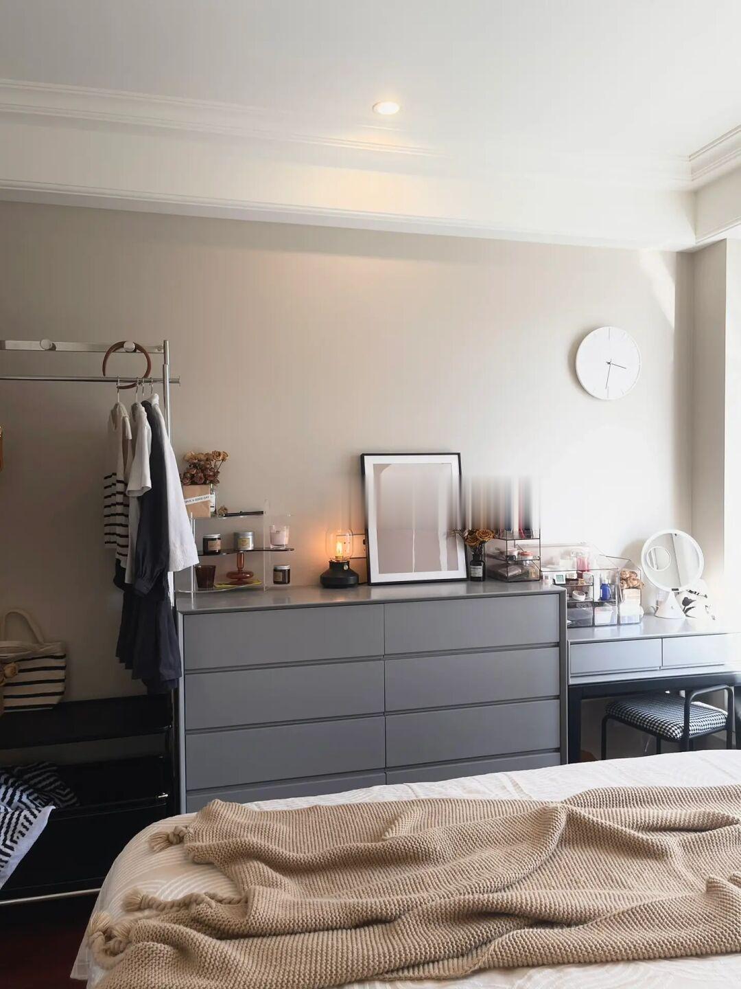 ▫️床尾布置八斗柜+梳妆台+隔夜衣架,灰色+黑色。