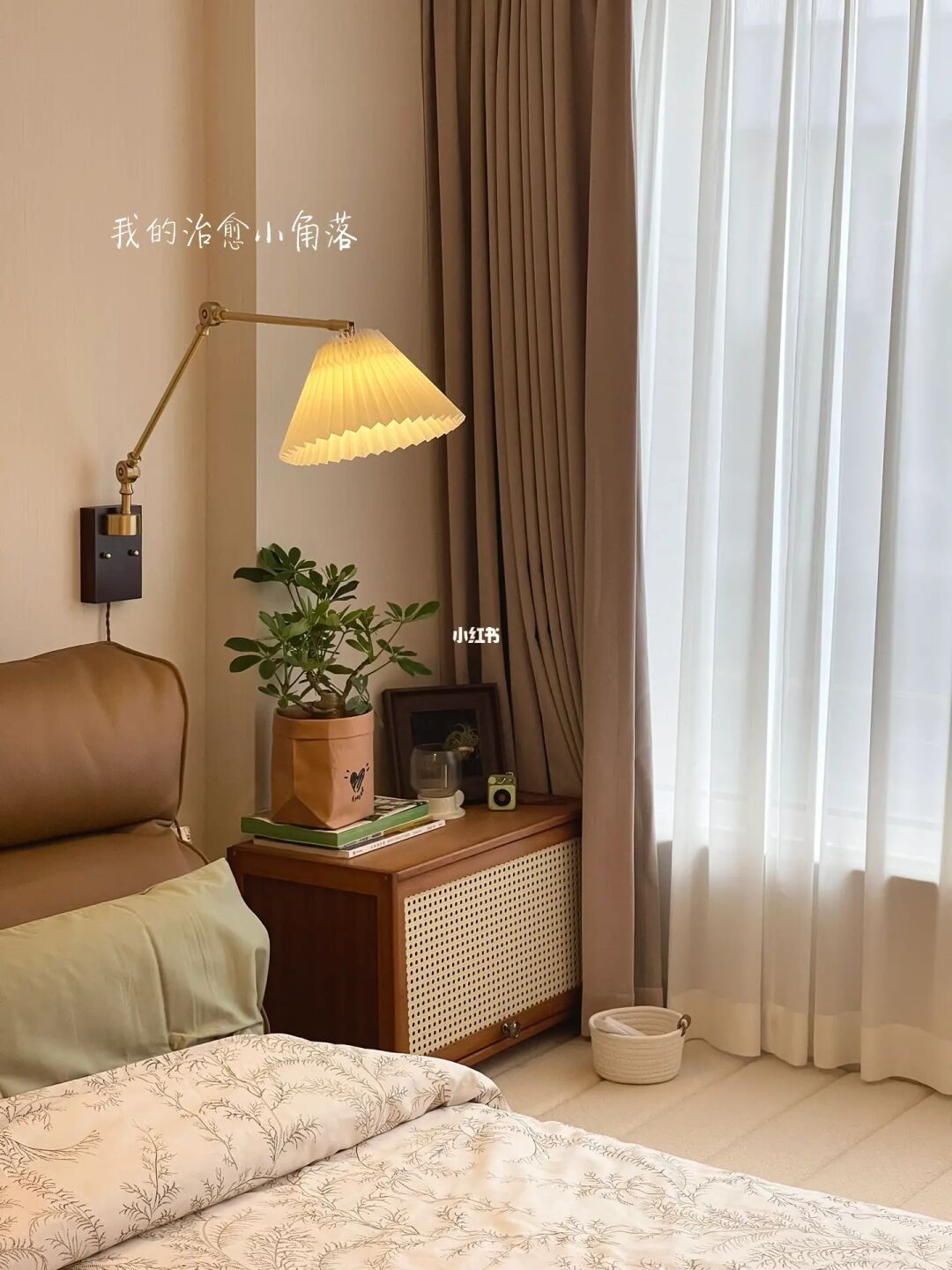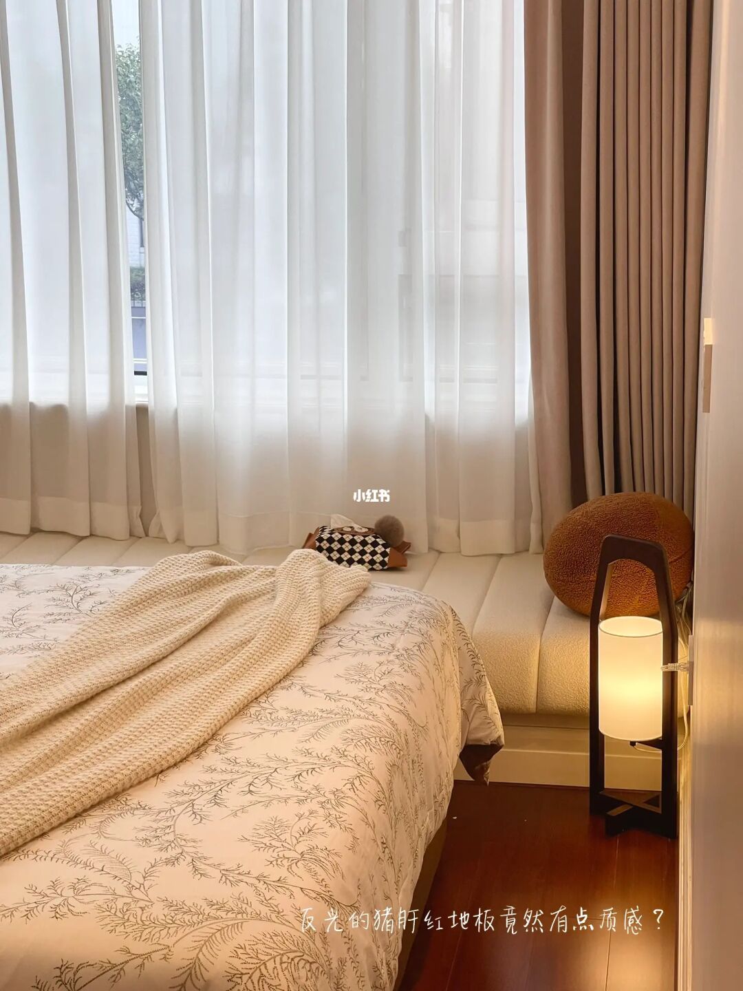 . 阴雨天🌧️的小次卧没想到这么舒服~ 温暖的布艺、治愈的灯光和随风摆动的纱帘, 都能让我在这个小空间安静放松下来。 / 精装交付的猪肝红地板在不拆改的情况下, 自己一点点尝试着软装搭配也能改造成复古风~ 不同深浅棕色系🟤软装,是现在很🔥的“美拉德”风格, 秋天的🍂的氛围感满满, 甚至连猪肝红地板一下子也有了沉静内敛的质感。 / 猪肝红地板既然“打不过”,那就选择加入咯~ 精心布置的轻复古小卧室真的越来越爱了💗 .