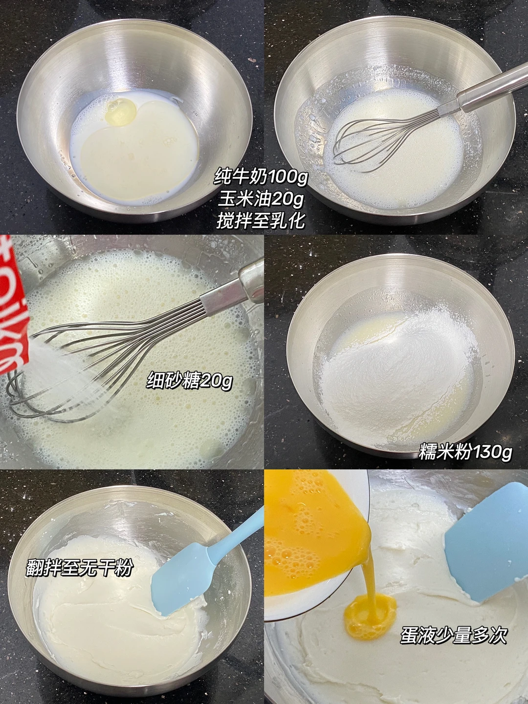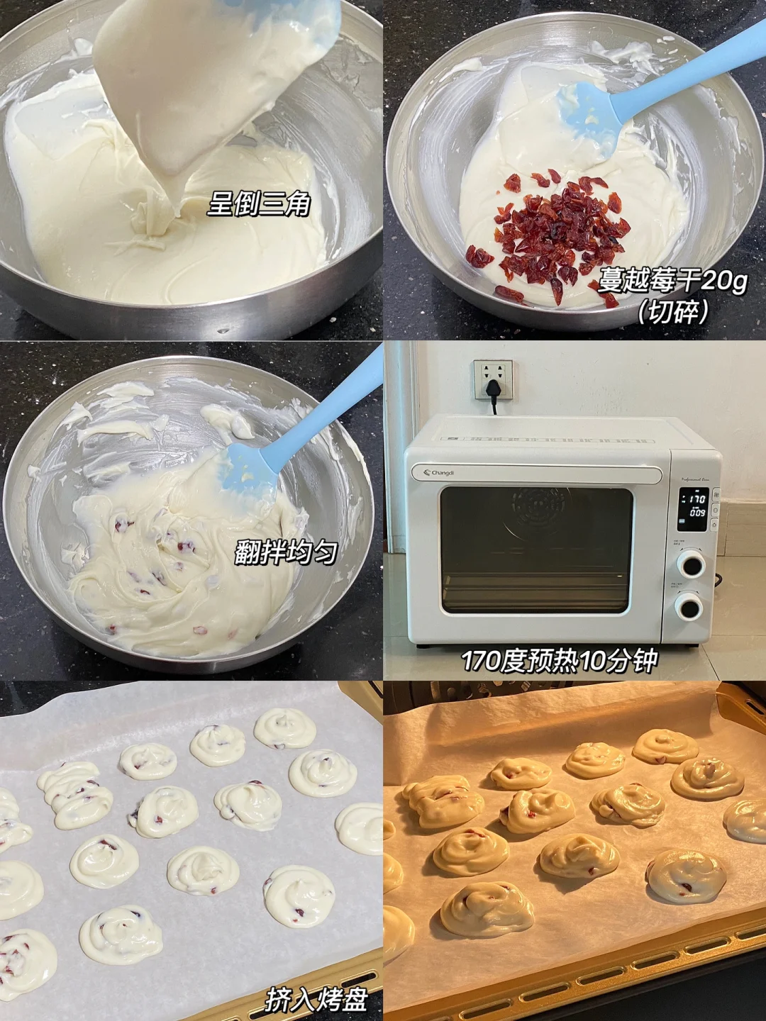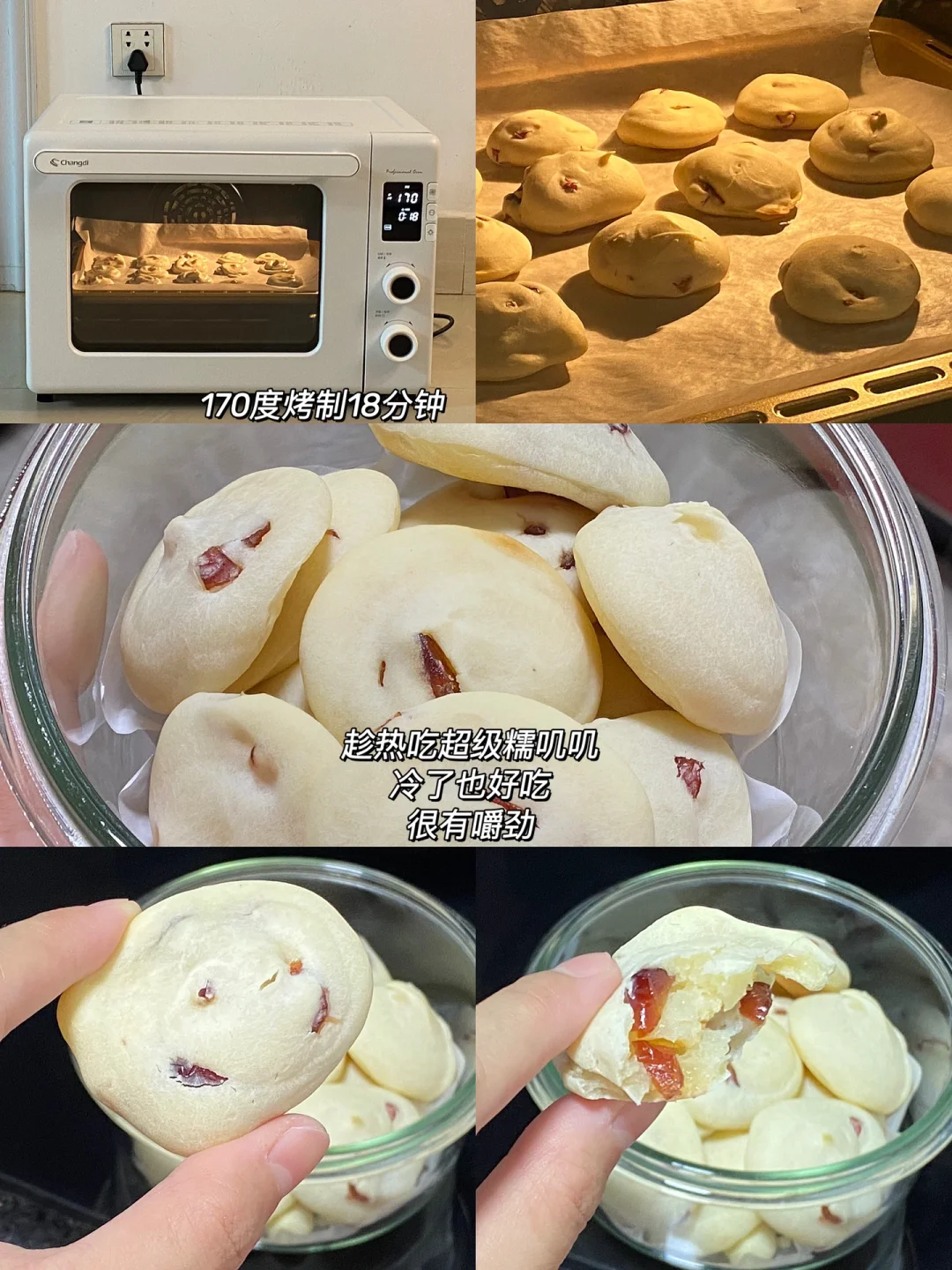 🌷食材:糯米粉130g,纯牛奶100g,玉米油20g,细砂糖20g,鸡蛋一个(用不完),蔓越莓干20g。 🌷做法:1.纯牛奶、玉米油搅拌至乳化。 2.加入细砂糖,筛入糯米粉,翻拌至无干粉。 3.蛋液少量多次加入(用不完)呈倒三角状态即可,倒入切碎的蔓越莓干,翻拌均匀。 4.挤入烤盘,提前预热烤箱,170度烘烤18分钟。 🌷趁热吃超级糯叽叽,冷了也好吃,很有嚼劲,赶紧试试吧[哇R][哇R][哇R]