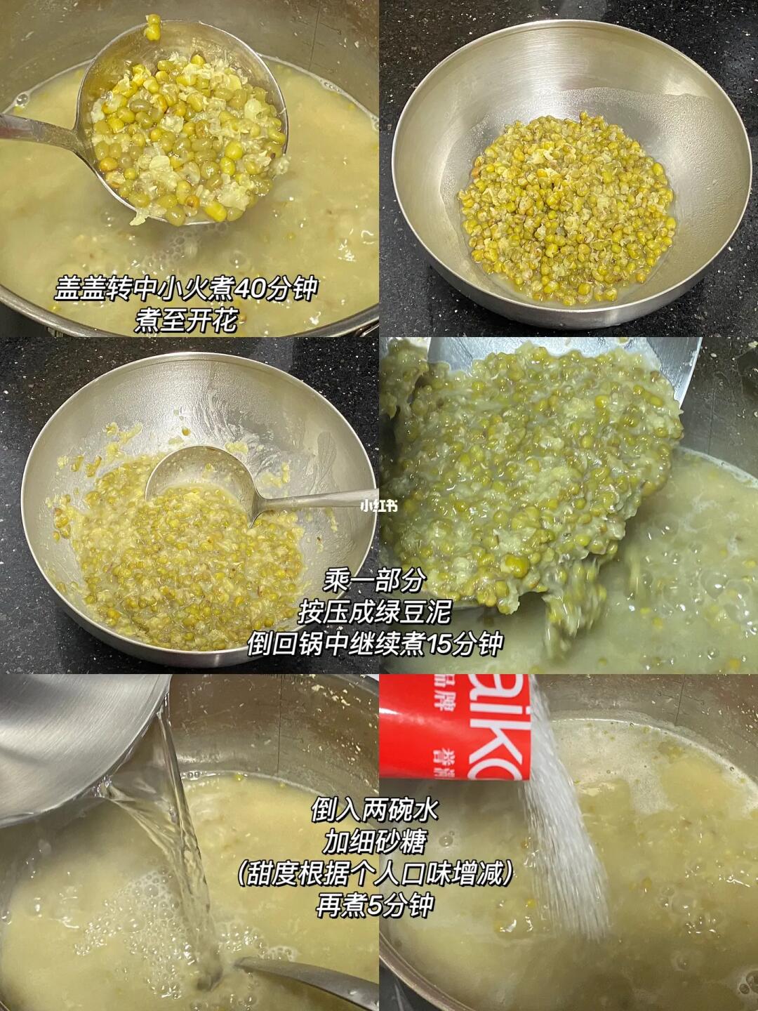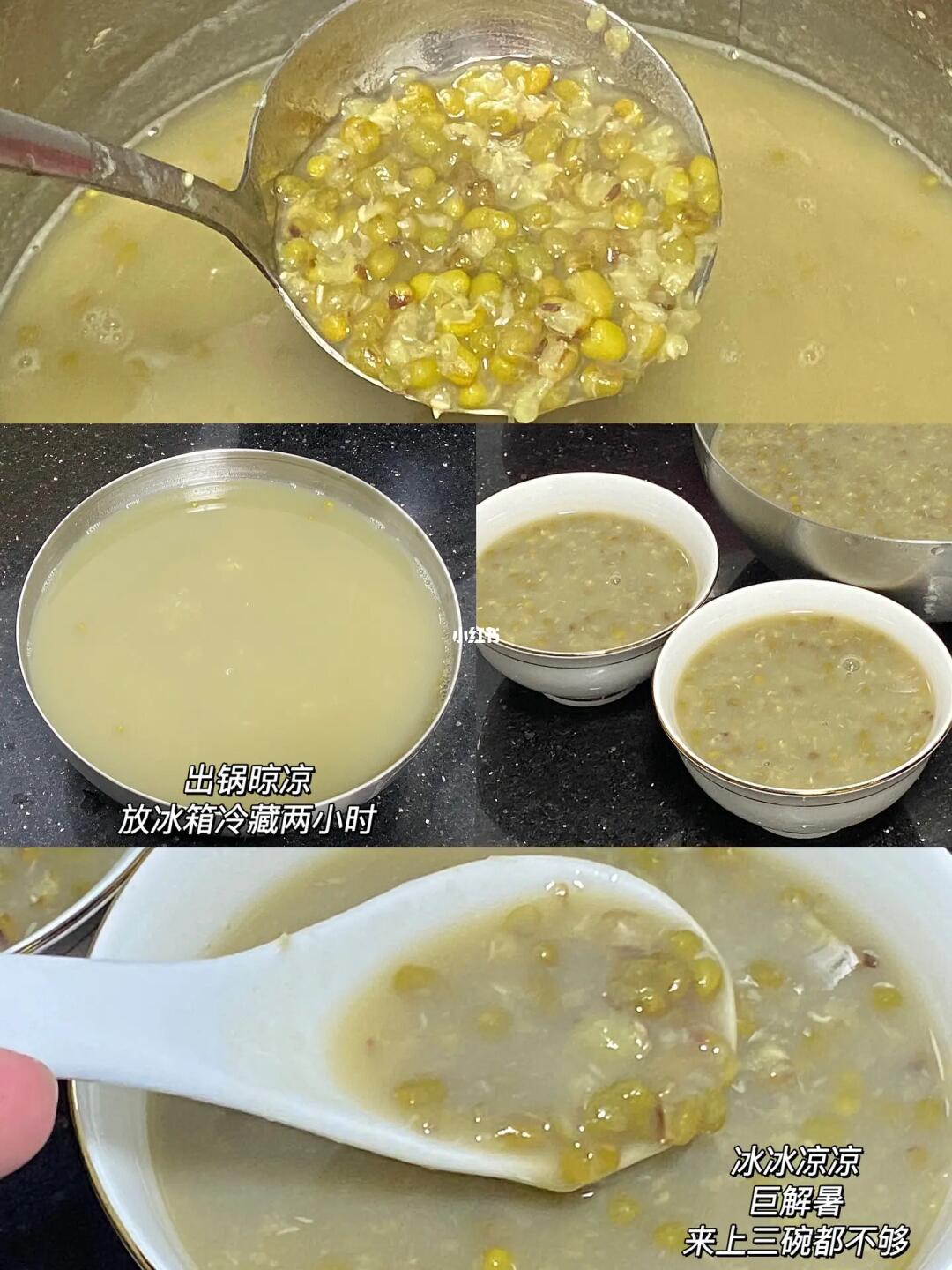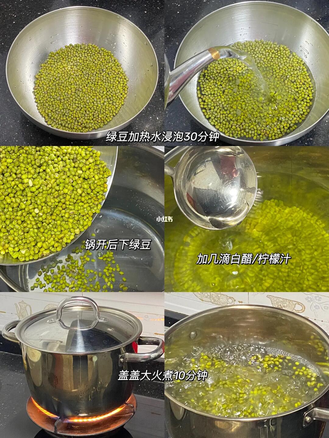 🌷食材:绿豆,细砂糖/冰糖,柠檬汁/白醋。 🌷做法:1.绿豆热水浸泡30分钟,锅开后下绿豆,几滴白醋或者柠檬汁,盖盖大火煮10分钟。 2.转小火煮40分钟,煮至开花,乘一部分绿豆,按压成绿豆泥,倒回锅中继续煮15分钟。 3.倒入两碗水,加细砂糖(甜度根据个人口味增减)再继续煮5分钟,出锅晾凉,放冰箱冷藏两小时。 🌷冰冰凉凉,巨解暑,来上三碗都不够[哇R][哇R][哇R]
