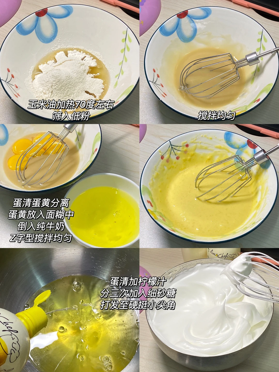 🌷做法:1.玉米油加热至70度左右,筛入低粉搅拌均匀,蛋清蛋黄分离,蛋清拿去冰箱冷藏,蛋黄放入面糊中,倒入牛奶,Z字型搅拌均匀。