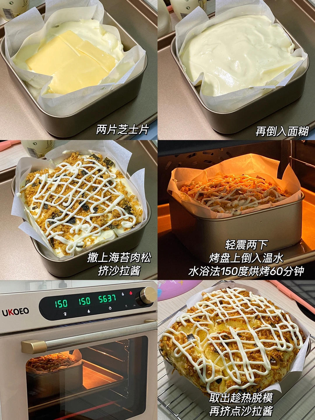 5.烤盘中倒入温水,烤箱提前预热,水浴法150度烘烤60分钟,取出趁热脱模,再挤一点沙拉酱。