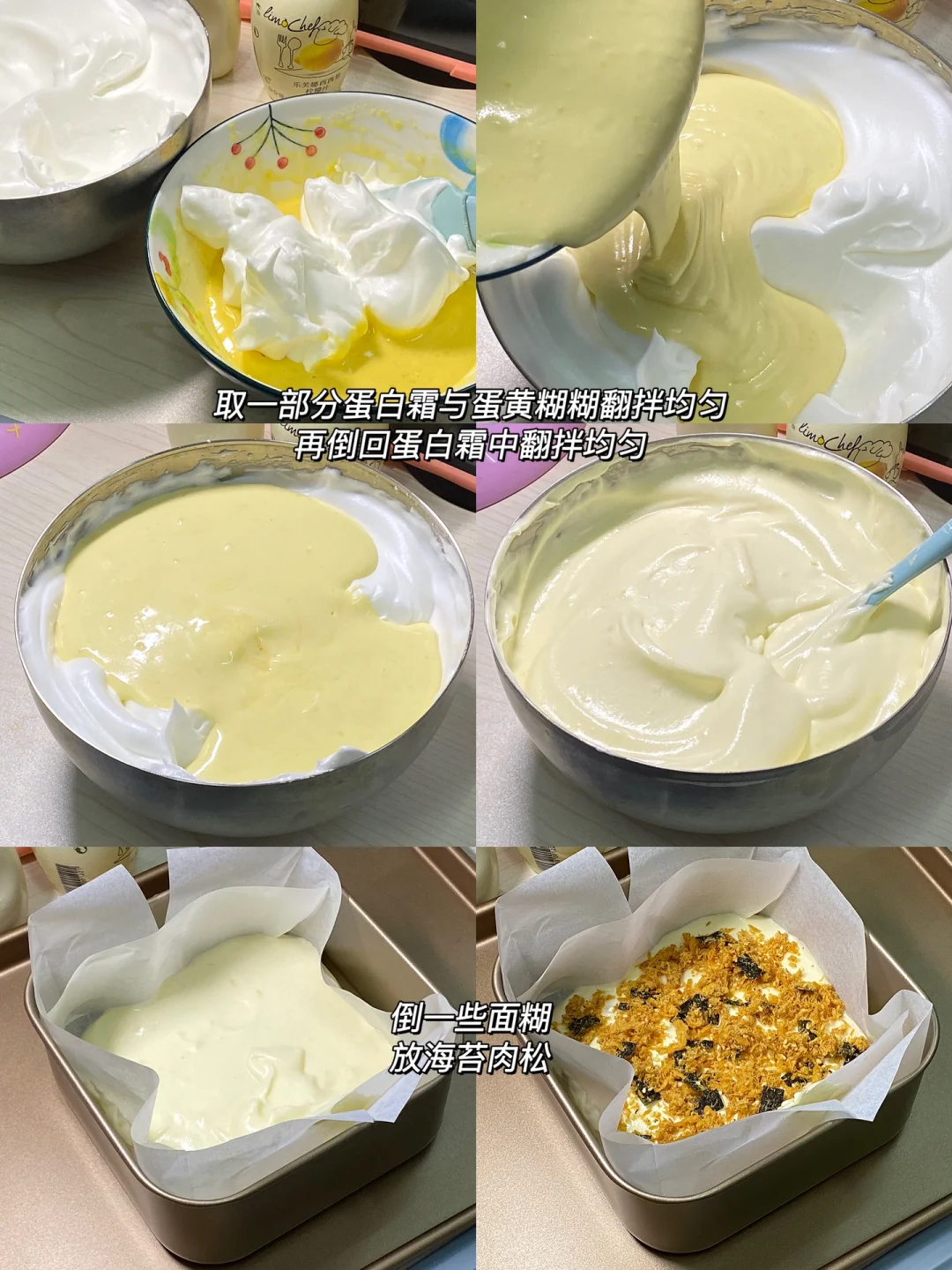 4.模具垫烘焙纸,倒一些糊糊,放入海苔肉松,再倒入面糊,放入芝士片,最后把面糊全部倒进去,轻震几下,撒上海苔肉松,挤沙拉酱。