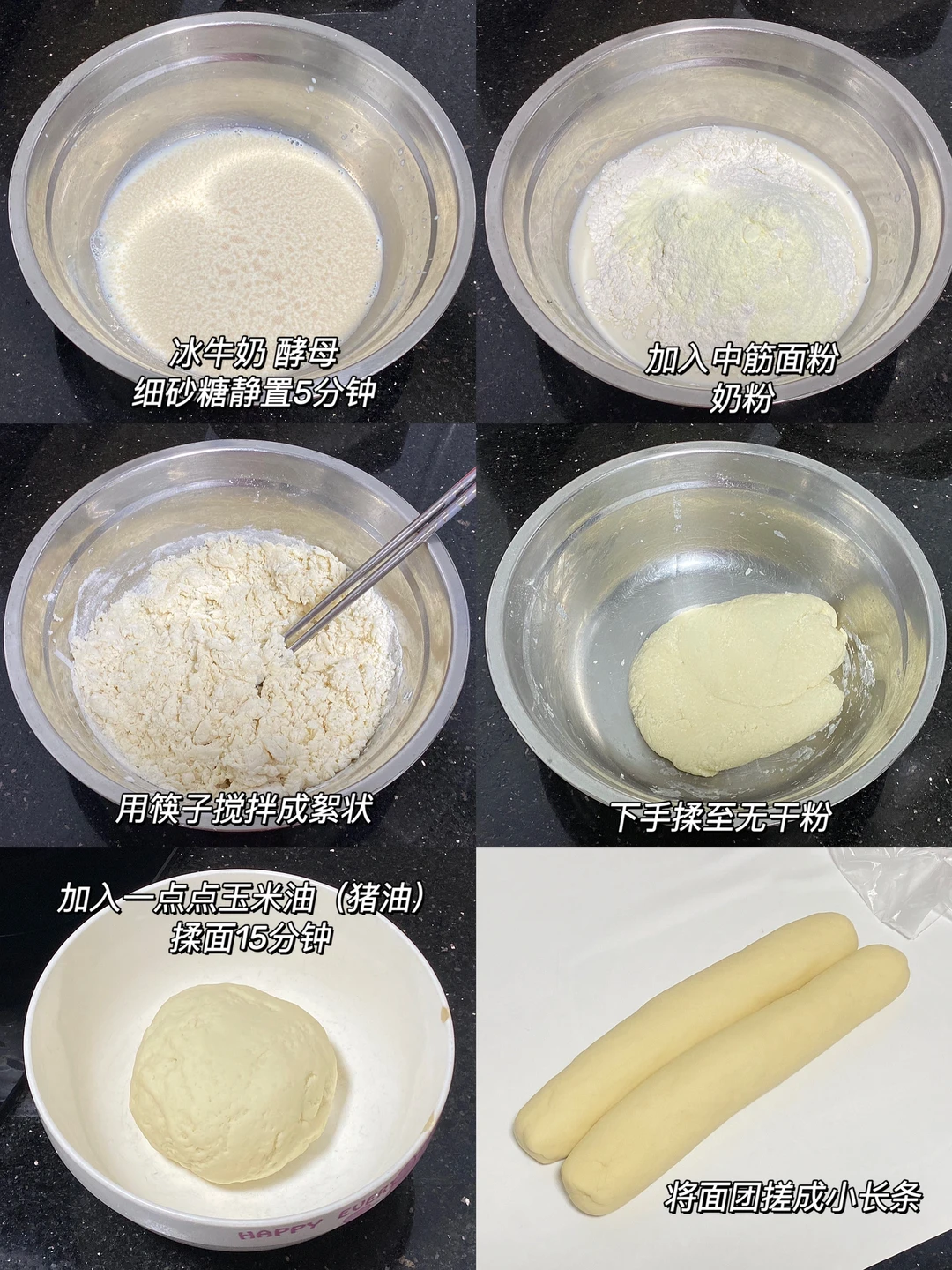 🌷食材:冰牛奶100g,酵母2g,中筋面粉200g,玉米油5g,奶粉10g(增加奶香味)