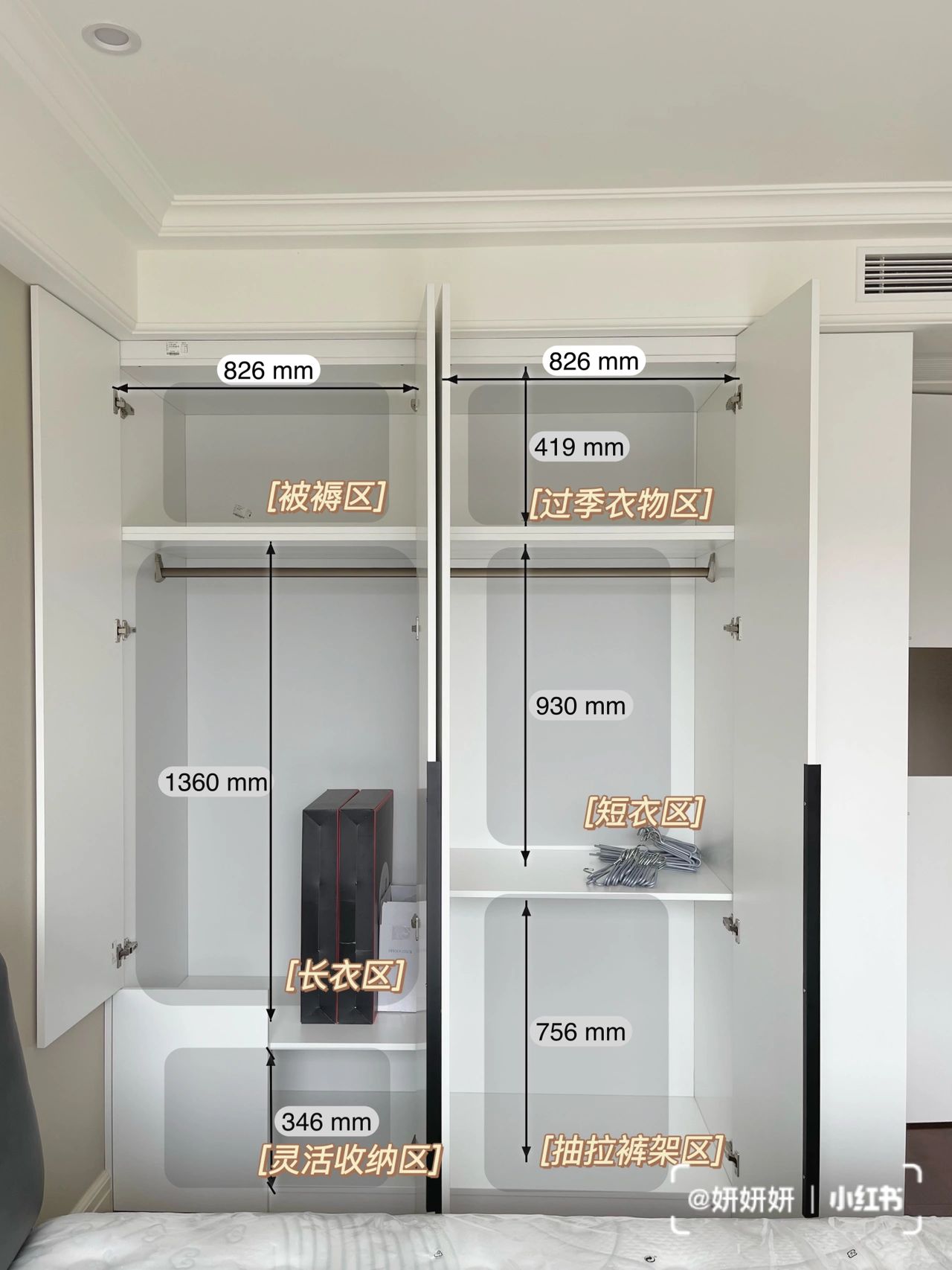 分为:被褥区、长衣服挂衣区、短衣挂衣区、抽拉裤架区(后续自行改造)、灵活收纳区