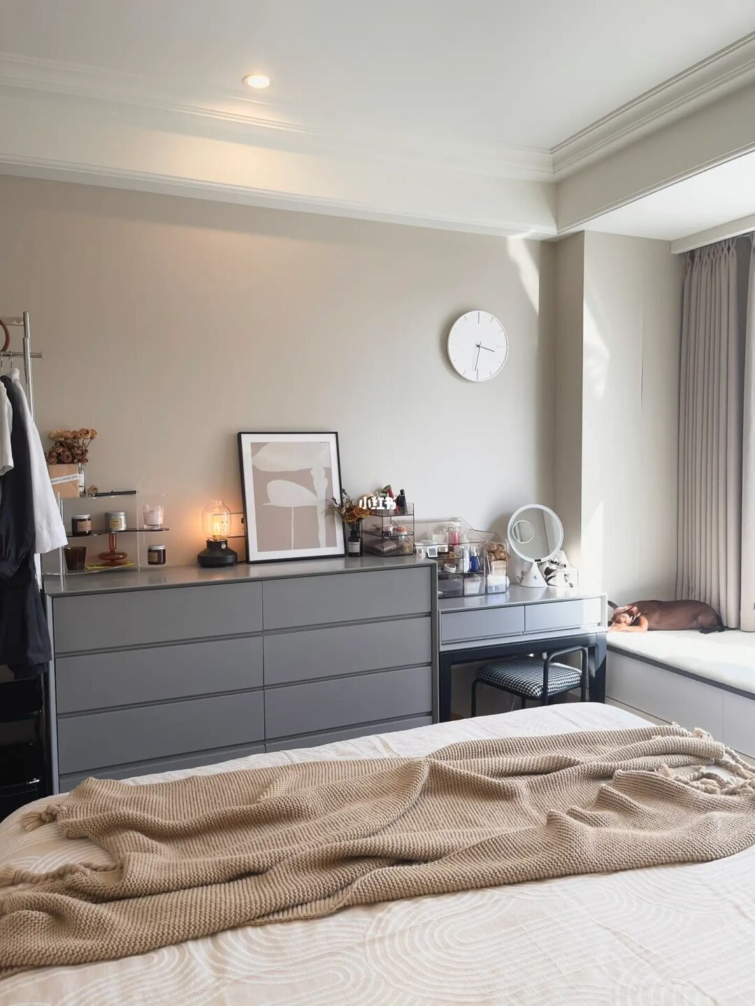 ④主卧 | 床尾布置斗柜+梳妆台,10㎡的房间也能充分利用床尾空间,柜子收纳,台面摆放各种装饰品。