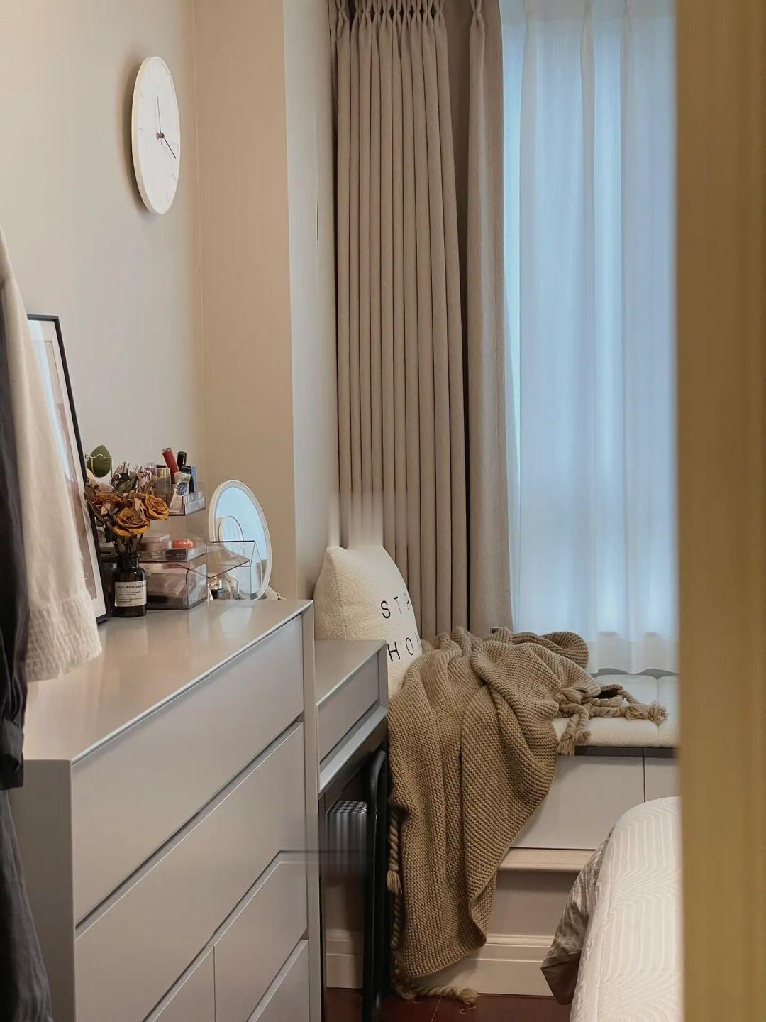 ⑤主卧 | 飘窗定制飘窗柜和垫子,4个大抽屉解决收纳又可以作为休闲小空间。