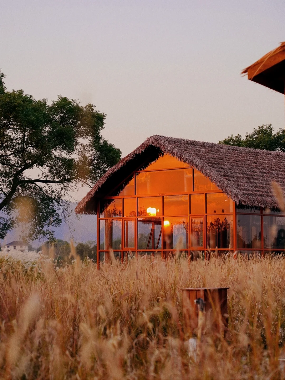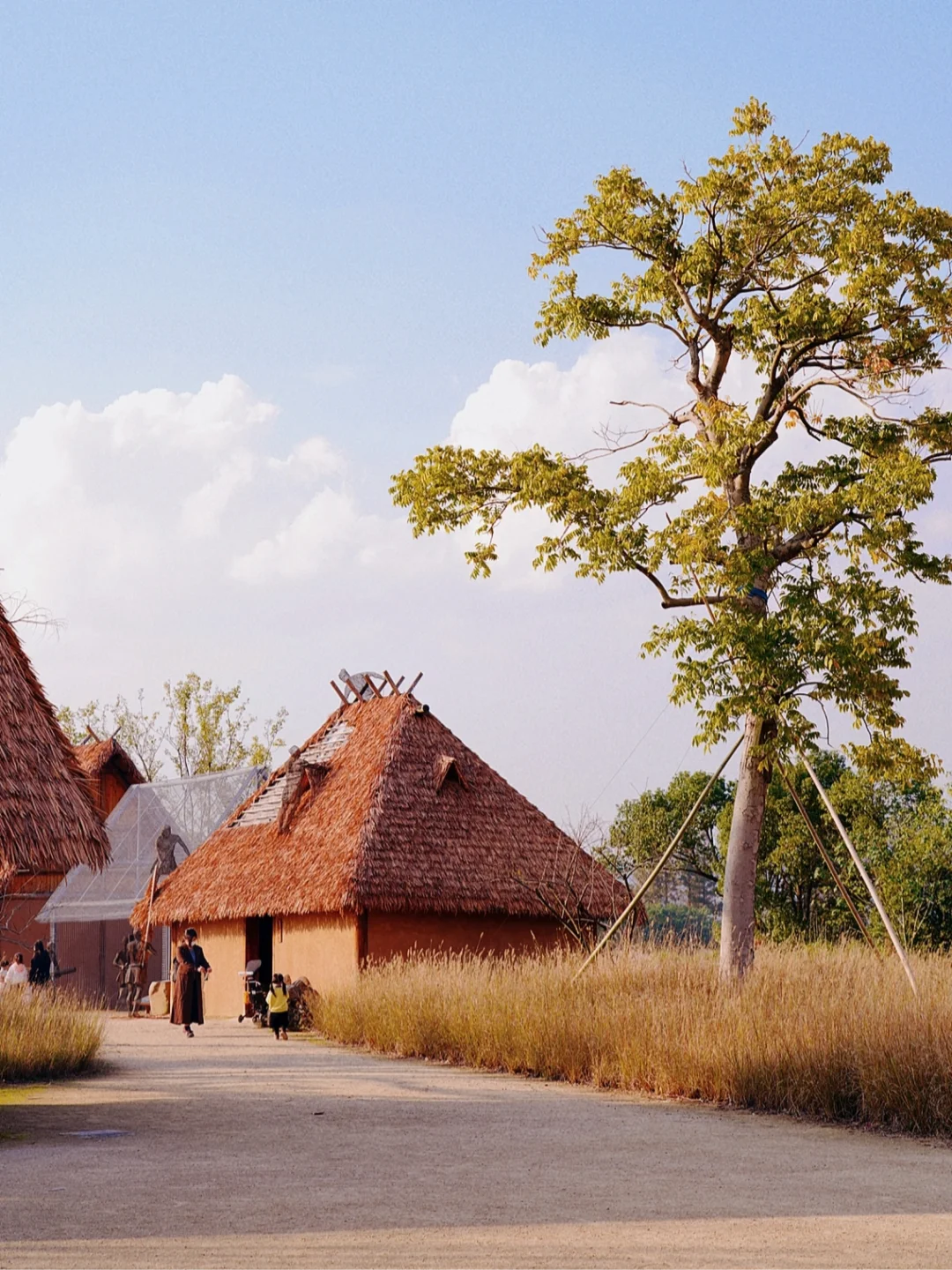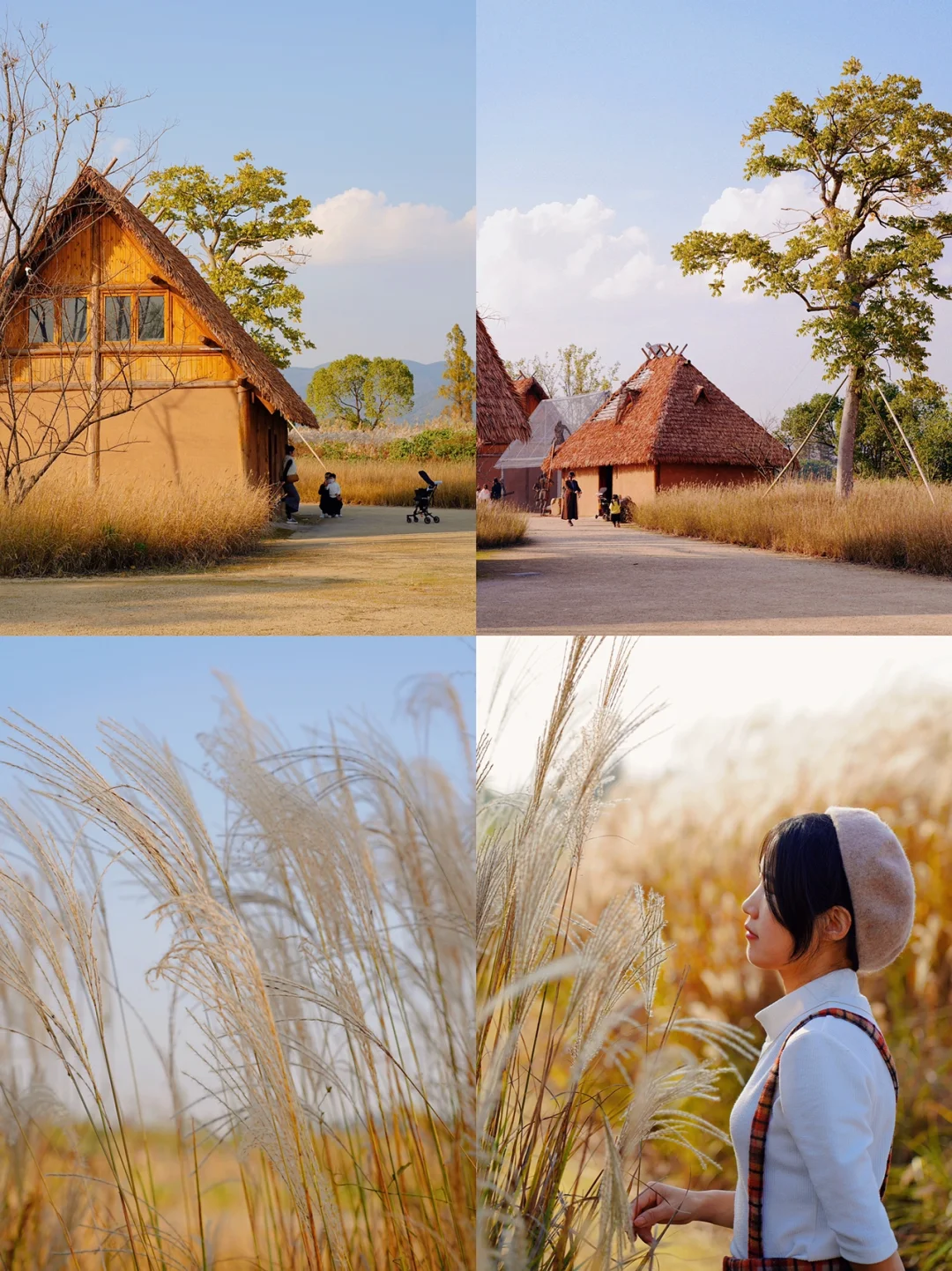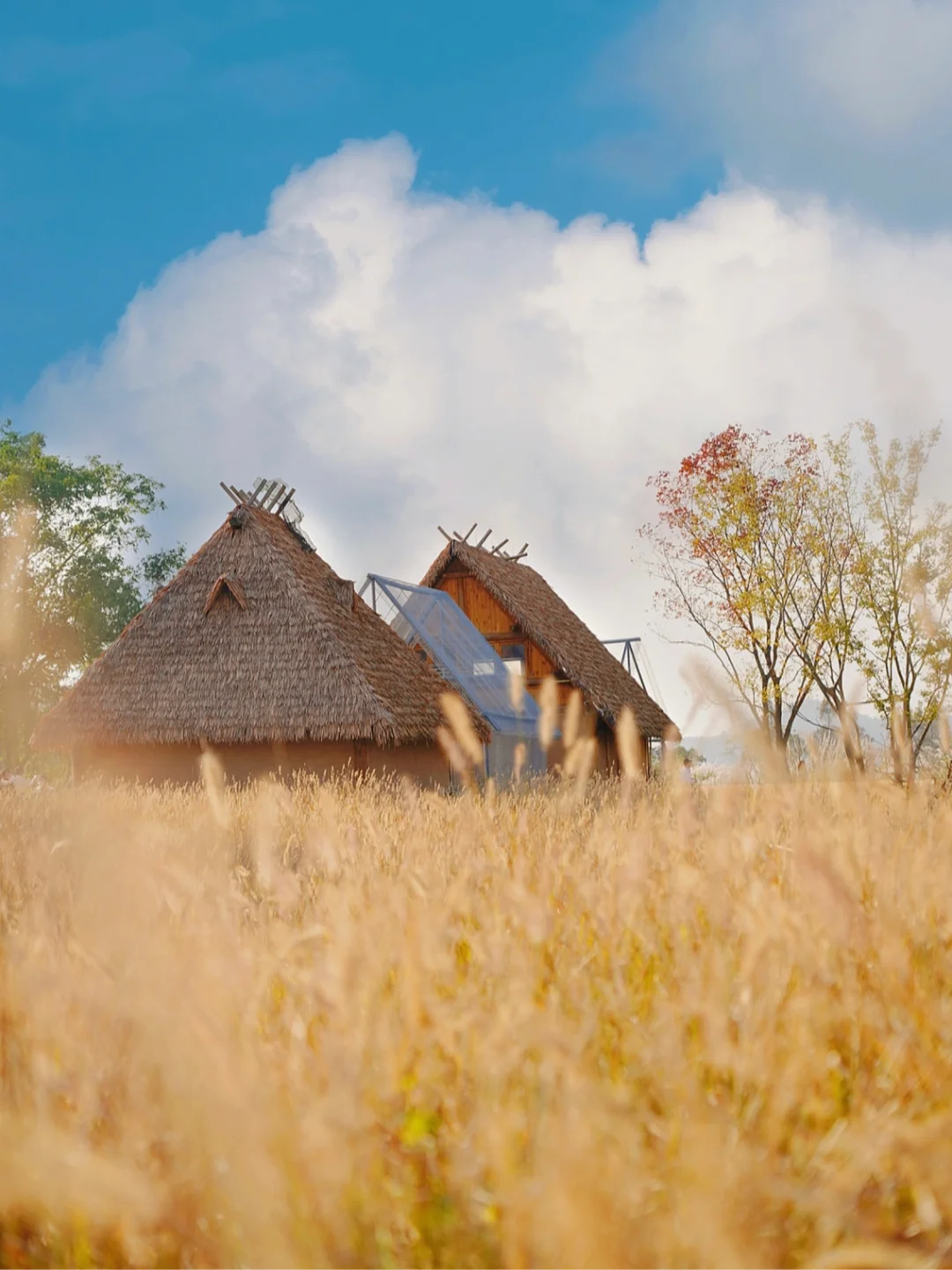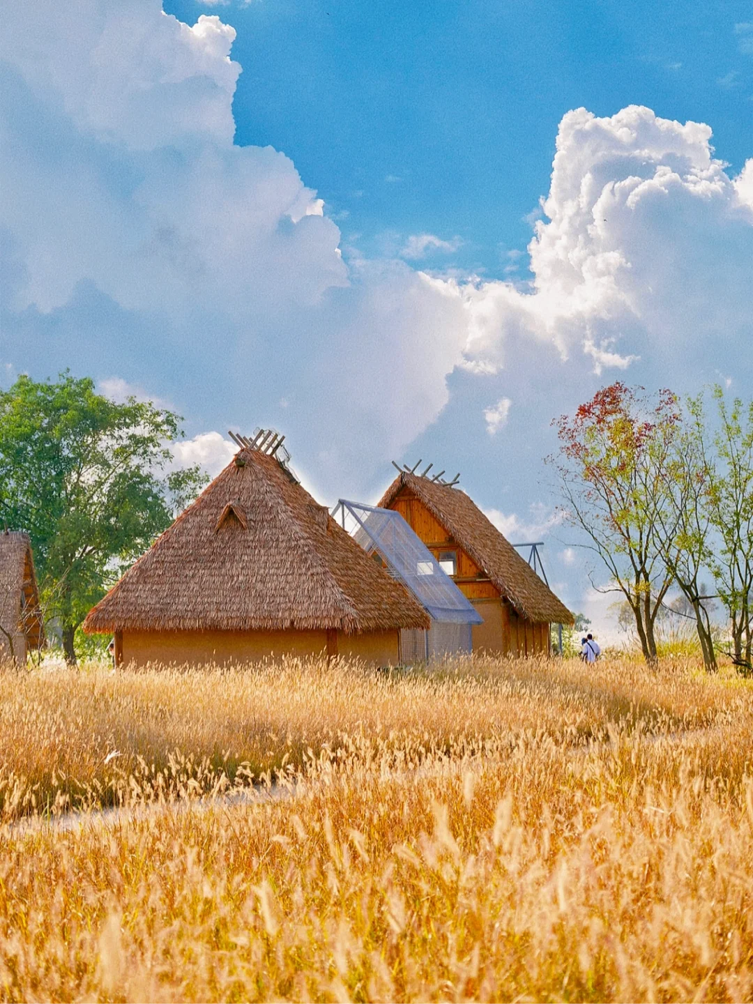 金黄色稻田、大片斜坡草坪、茅草屋、花海、芦苇、鹿园、鸽舍等;
