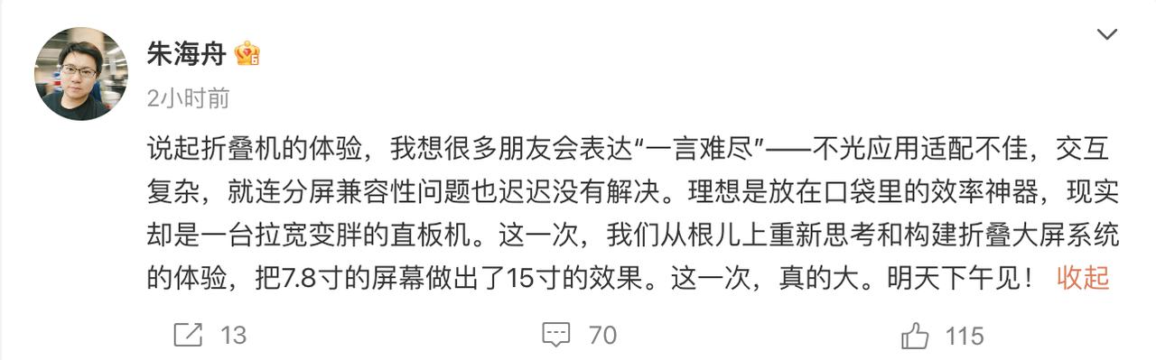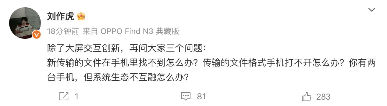 系统不兼容真的好麻烦……最近看到好多iPhone转华为Mate60 Pro的朋友,一直在吐槽,搬个数据弄半天,200G的微信数据,传了好几个小时,而且有些东西还不能直接互传,只能手动发,本来还想两台一起用的,但是俩生态,用起来太累人了。 今天还刷到了OPPO高管刘作虎的微博,有点说到我心底里去了。新传输的文件不知道去哪了?文件格式在手机里打不开?两台手机生态不兼容?这三个问题真的很烦人,绿厂有啥办法呢?看官方的意思,这次应该会在OPPO Find N3身上一口气解决?另一位高管朱海舟还声称,要把7.8寸的屏幕做出15寸的效果,看来OPPO大折叠这次在交互上很有看头,数码闲聊站还爆料这次会有媲美Mac触摸板的新体验,期待算是拉满了。 不管是大折叠也好,直板机也好,总算有厂商愿意花心思在系统交互做创新了,这是好事,等着看19号发布会绿厂的猛料吧。 #OPPO Find N3#