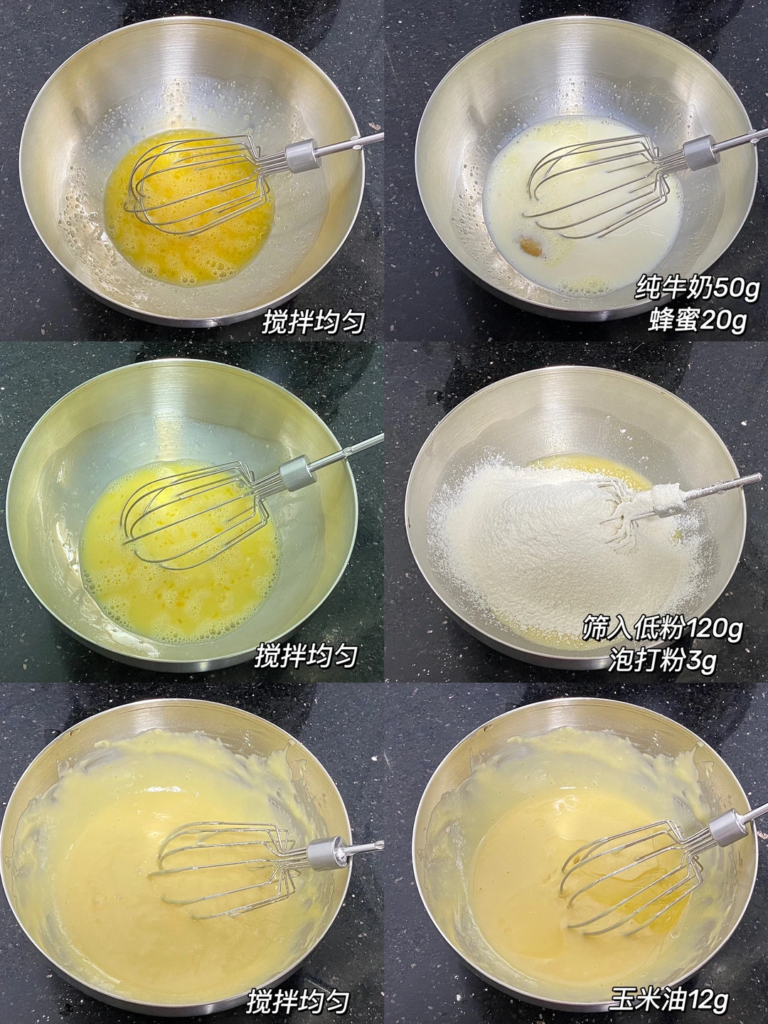 🥞饼皮:鸡蛋两个,纯牛奶50g,蜂蜜20g,低粉120g,泡打粉3g,玉米油12g。