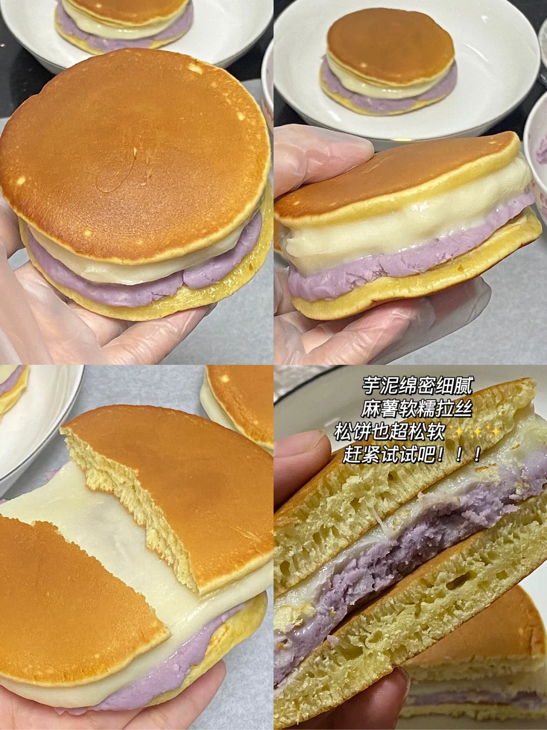 🥞组装:一片铺上芋泥,另外一片铺上麻薯,再盖上,这个配方做的松饼超级松软,芋泥绵密细腻,麻薯软糯拉丝,赶紧试试吧[派对R][派对R][派对R]