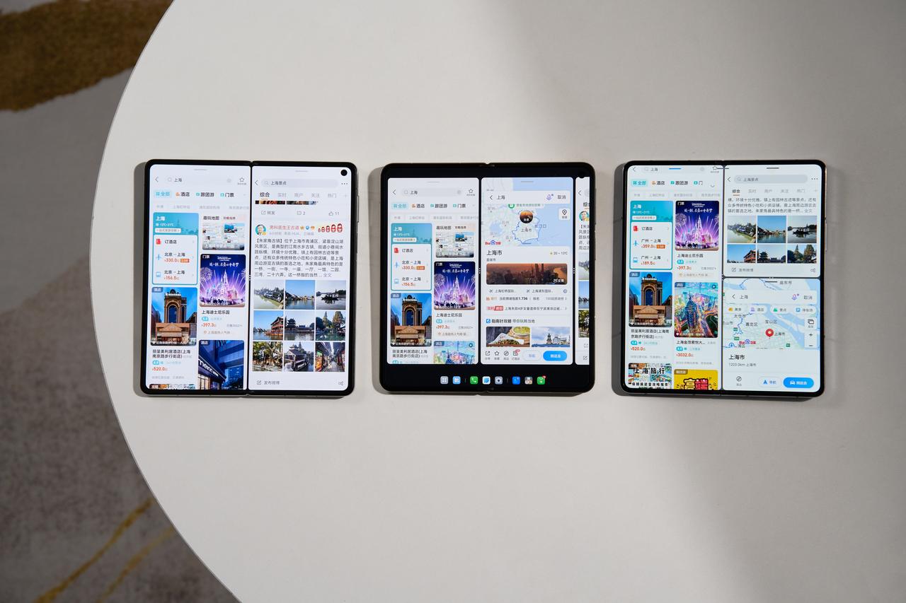 抛开情怀不谈,上手一整天,和大家聊聊华为、三星、OPPO关于交互最真实的体验,这一次Mate X5也许没办法“遥遥领先”了…… 不知道大家发现没有,折叠屏的分屏真的很难用,我以前用过一段时间,感觉还不如小窗来得舒服,说到底还是分屏功能不好使,很多APP要么压根没适配分屏,要么分屏之后比例很别扭,不知道现在各家做得怎么样呢? 先来看Mate X5(图3),华为的分屏我觉得挺稳的,动画做得很流畅,而且适配的APP也比较多,支持左右/上下分屏,一边刷剧一边聊天,算是国产里这么多大折里的第一梯队了,很省心。 再来说说三星Z Fold5(图4),它的分屏体验挺难评价的,实际用的时候不少APP不支持分屏,像某宝某东,还要上网找教程,不过支持三分屏这一点给好评,可以开三个APP一起比价,属于是不省心但好用型。 最后是OPPO Find N3(图5、6),我觉得OPPO的折叠屏真的是有在花心思搞创新,也支持三分屏,也有底部任务栏,但是它搞了个“虚拟屏”,比如我在开会,挂着会议APP、文档还有浏览器,会议APP和浏览器可以全尺寸分屏,但是可以放在虚拟屏里,不占用实体屏幕空间,属于待命状态,我想用浏览器查点东西的时候,可以马上把浏览器以全尺寸的模式呼出,根本不用调整它的大小,反应非常快,不用的时候我又可以用最大的空间来专注阅读文档。 对比下来,我觉得OPPO这种“不公平”的分屏做法更符合现实,像华为、三星这种做法,对空间的利用率其实还不够高,而且OPPO的分屏,基本什么APP都能适配,这一点让我觉得很省心,看来OPPO这次折叠屏敢卖9999元确实是有底气的,比起硬件,系统才是折叠屏的灵魂。 #OPPO Find N3#