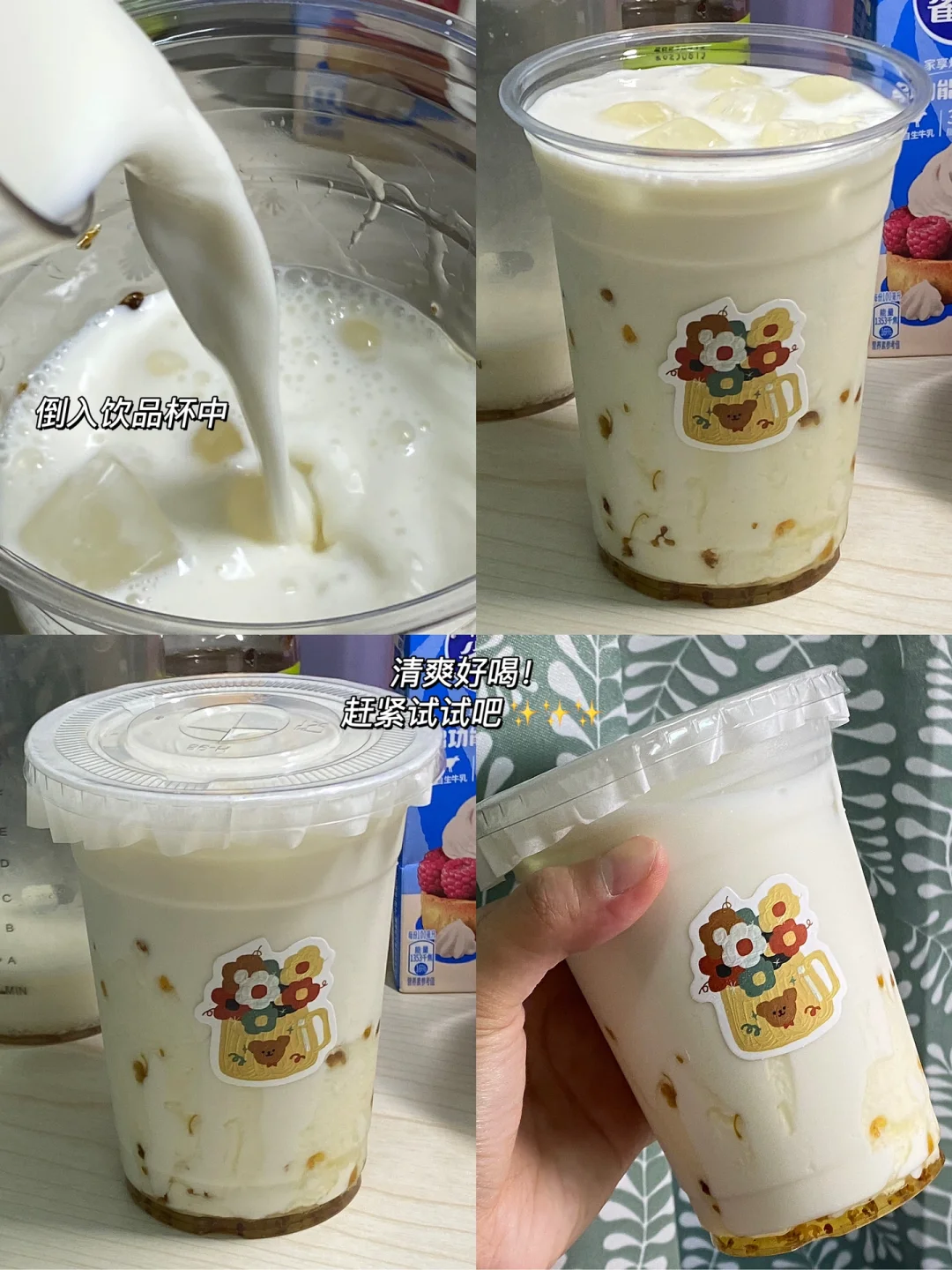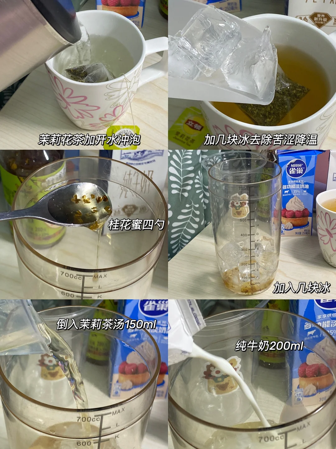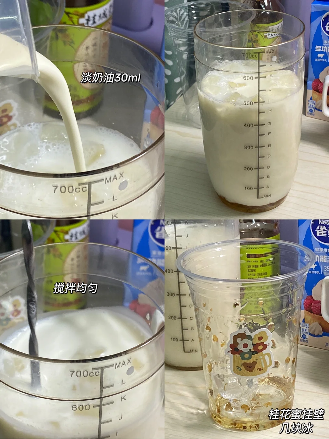 🌷食材:桂花蜜,淡奶油,纯牛奶,茉莉花茶,冰块。 🌷做法:1.茉莉花茶包加入开水冲泡,冲泡好后加入冰块降温,去苦涩。 2.雪克杯中加入四小勺桂花蜜,加入几块,倒入茶汤、纯牛奶、淡奶油,搅拌均匀。 3.饮品杯中桂花蜜挂壁,加入几块冰,倒入饮品杯中。 🌷桂花蜜的甜香搭配着醇厚的牛乳茶,清爽好喝,赶紧试试吧[派对R][派对R][派对R]