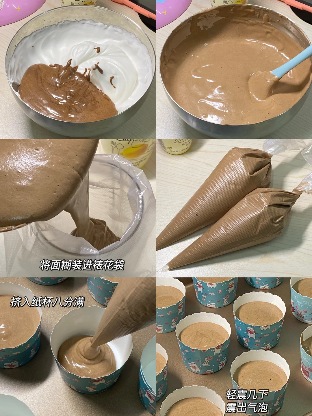 4.取一部分蛋白放入蛋黄糊糊中,翻拌均匀,再倒回蛋白中翻拌均匀,挤入纸杯八分满,轻震几下,震出气泡。