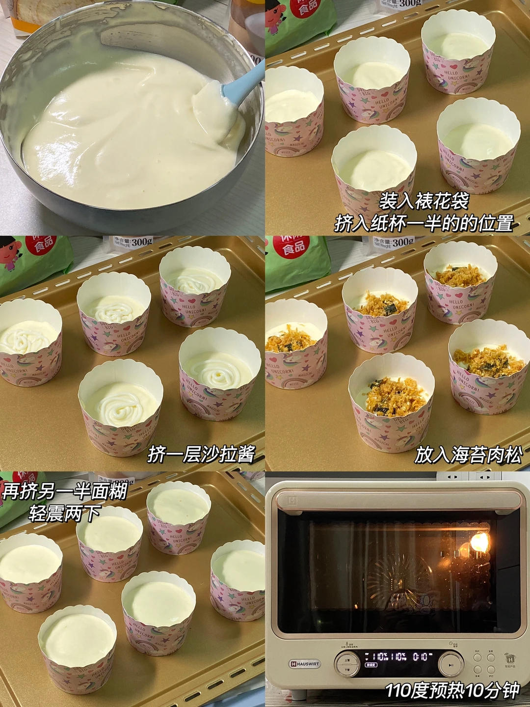 5.取一部分蛋白放入蛋黄糊中翻拌均匀,再倒回蛋白中翻拌均匀,装入裱花袋,挤入纸杯一半的位置,挤一层沙拉酱,放海苔肉松,再挤入另外一半面糊,再铺上一层肉松。