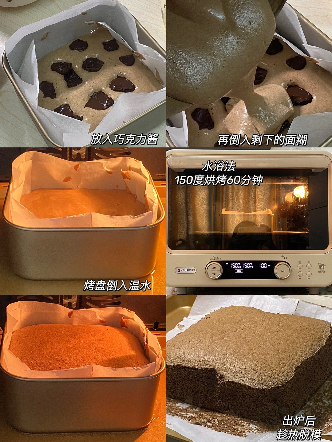 5.从高处倒入一半面糊整理平整,放入巧克力酱,再倒入剩余面糊,烤盘倒入温开水,150度预热15分钟,水浴法烘烤60分钟。