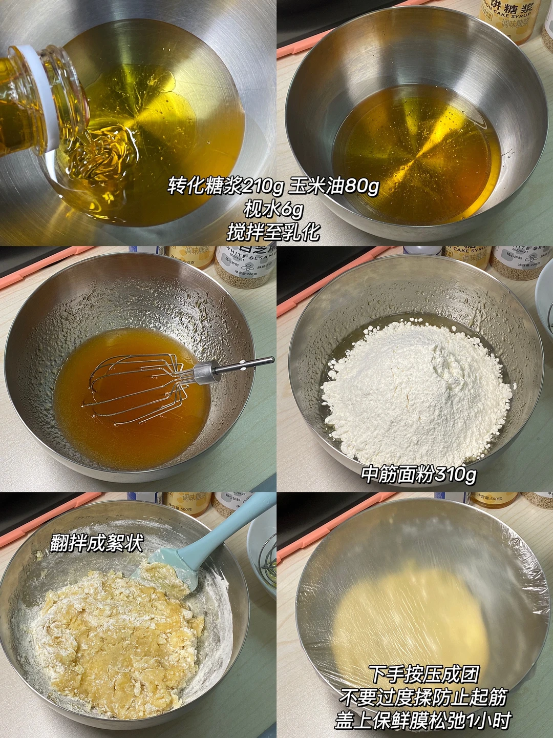 🥮饼皮食材:转化糖浆210g,玉米油80g,枧水6g,中筋面粉310g。